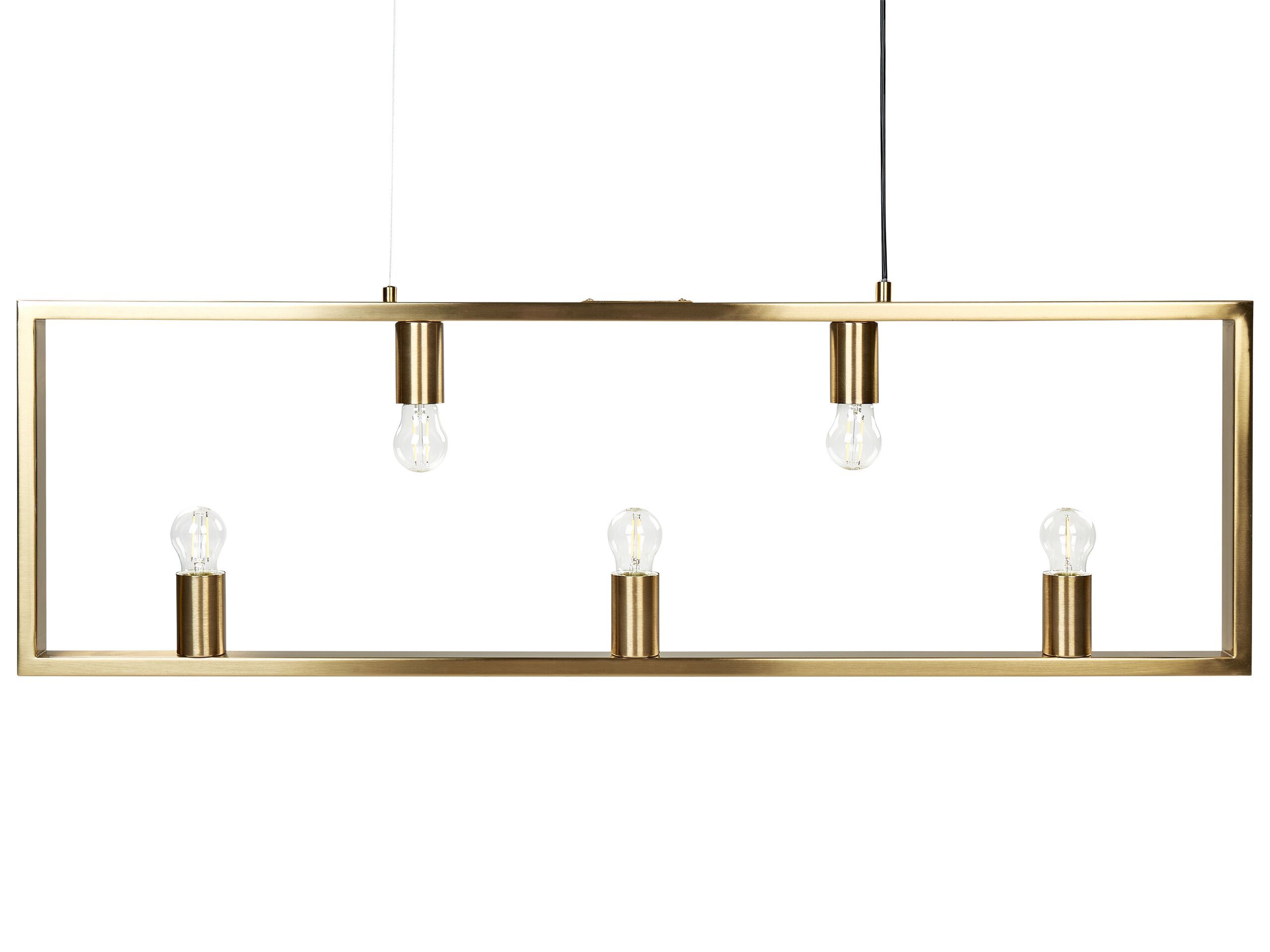 If you feel like your room needs a centrepiece or a bold accent, this ambient lamp is the right choice. It is an eye-catching geometric piece inspired by the industrial style. Its black rectangular frame is supported by two durable cords and five fully exposed light bulbs distribute bright light widely across space. It will look best hung above a large table in an open space and will bring all design elements of the room together. Details: Color: Brass. Main material: Iron. Additional material: PVC. Weight: 4 Assembly: Requires Installation and Assembly