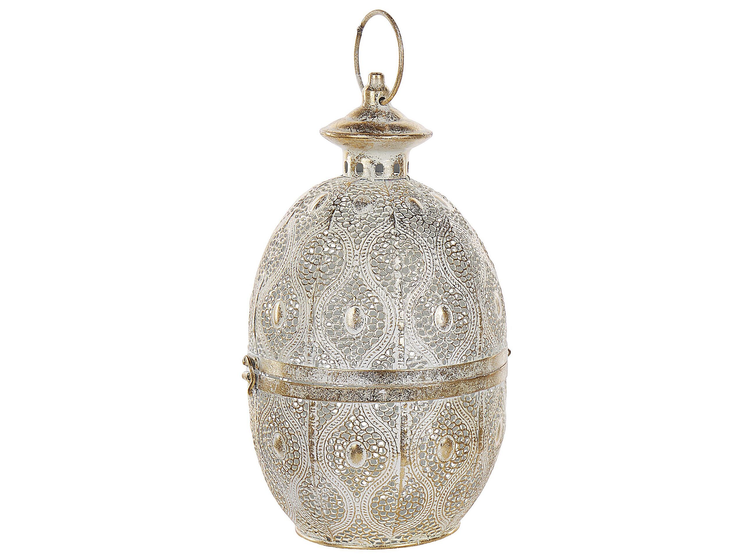 This delicate lantern is a fashionable accessory for modern and boho interiors. Not only does it provide a candlelight and distributes it thanks to the openwork design, but also introduces a lot of oriental charm to the room. The item resembling an egg is constructed from a thin metal and covered with gold paint with a purposefully distressed effect. Details: Color: Gold, White. Main material: Metal. Additional material: Glass. Weight: 1 Assembly: Does Not Require Assembly