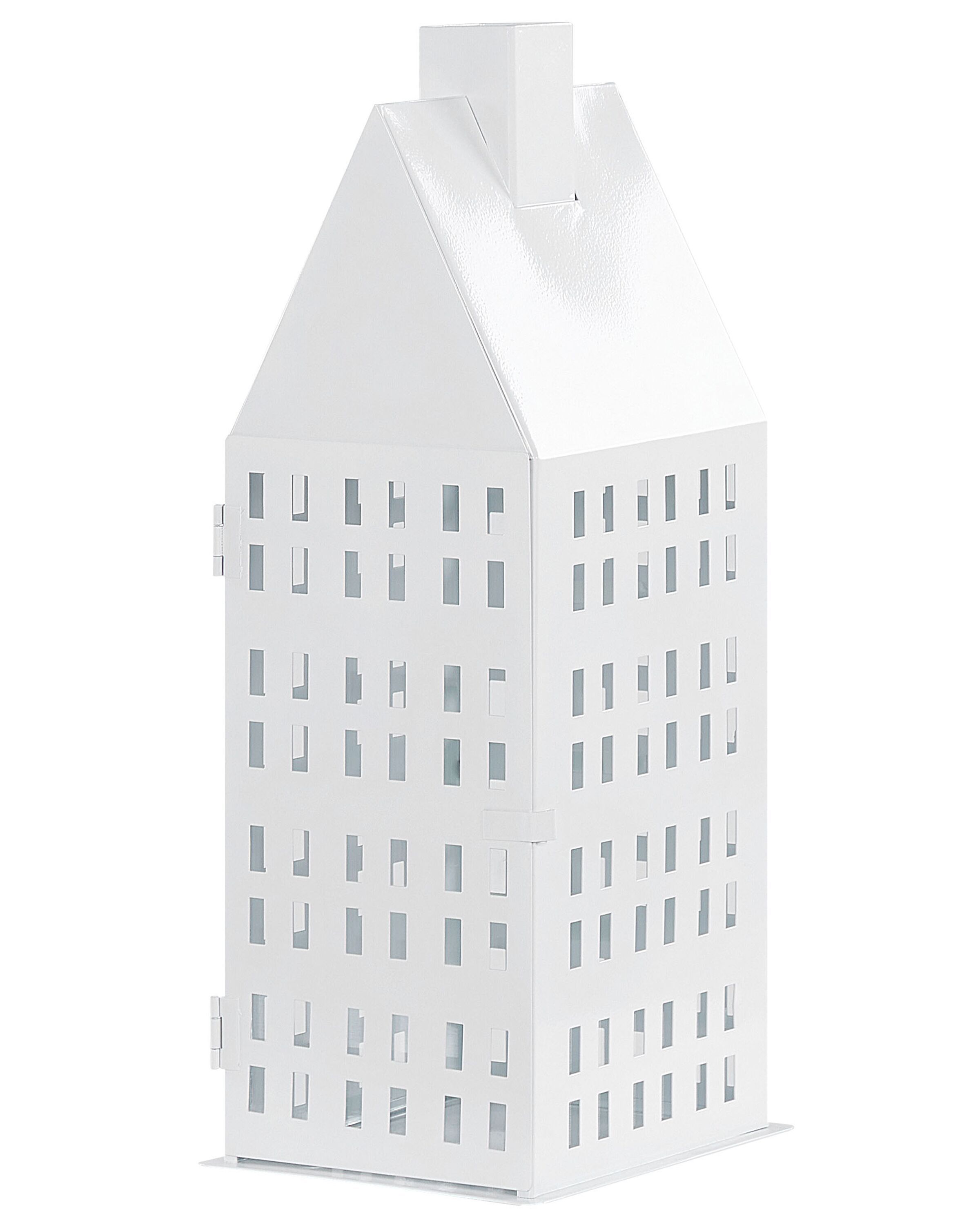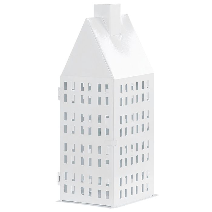This exceptional lantern in the shape of a house with a chimney is a beautiful, minimalistic ornamental piece. With a candle, the decoration will create a charming effect on the walls thanks to the multiple window-shaped holes covered with glass panes from the inside. The white colour and simple design make it work perfectly well with many interior designs. Details: Color: White. Main material: Iron. Additional material: Glass. Weight: 2 Assembly: Does Not Require Assembly