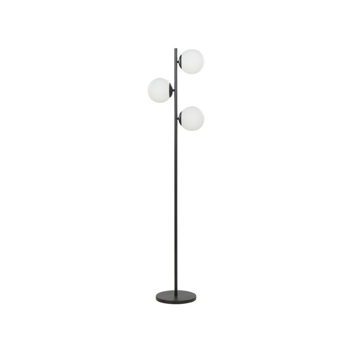 A floor lamp in an unusual form and three glass shades. Its universal, black hue perfectly matches interiors decorated in a classic or modern style. This lamp makes an eye-catching decorative element and works great as additional lighting in the living room or bedroom. Details: Color: Black. Main material: Metal. Additional material: Glass. Weight: 5 Assembly: Partial Assembly Required