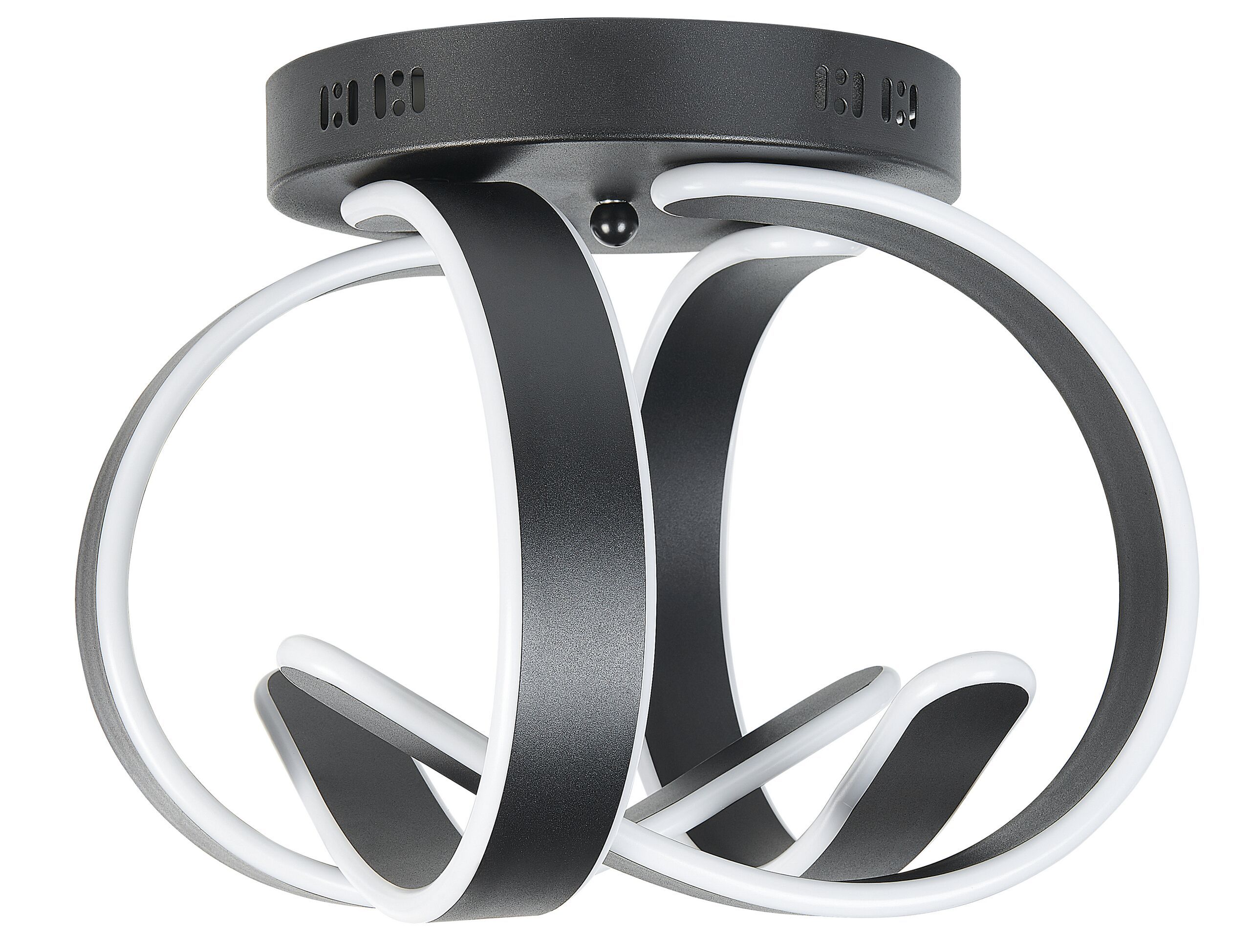 This eye-catching ceiling lamp in black adds a contemporary flair into your home. Thanks to its novelty shape and modern design, the piece works great as a dining room or living room lighting. Made of durable and easy-care aluminium and iron, the lamp comes with integrated LED lights, creating a warm atmosphere in any space. Details: Color: Black. Main material: Iron. Additional material: Silicone. Weight: 3 Assembly: Requires Installation