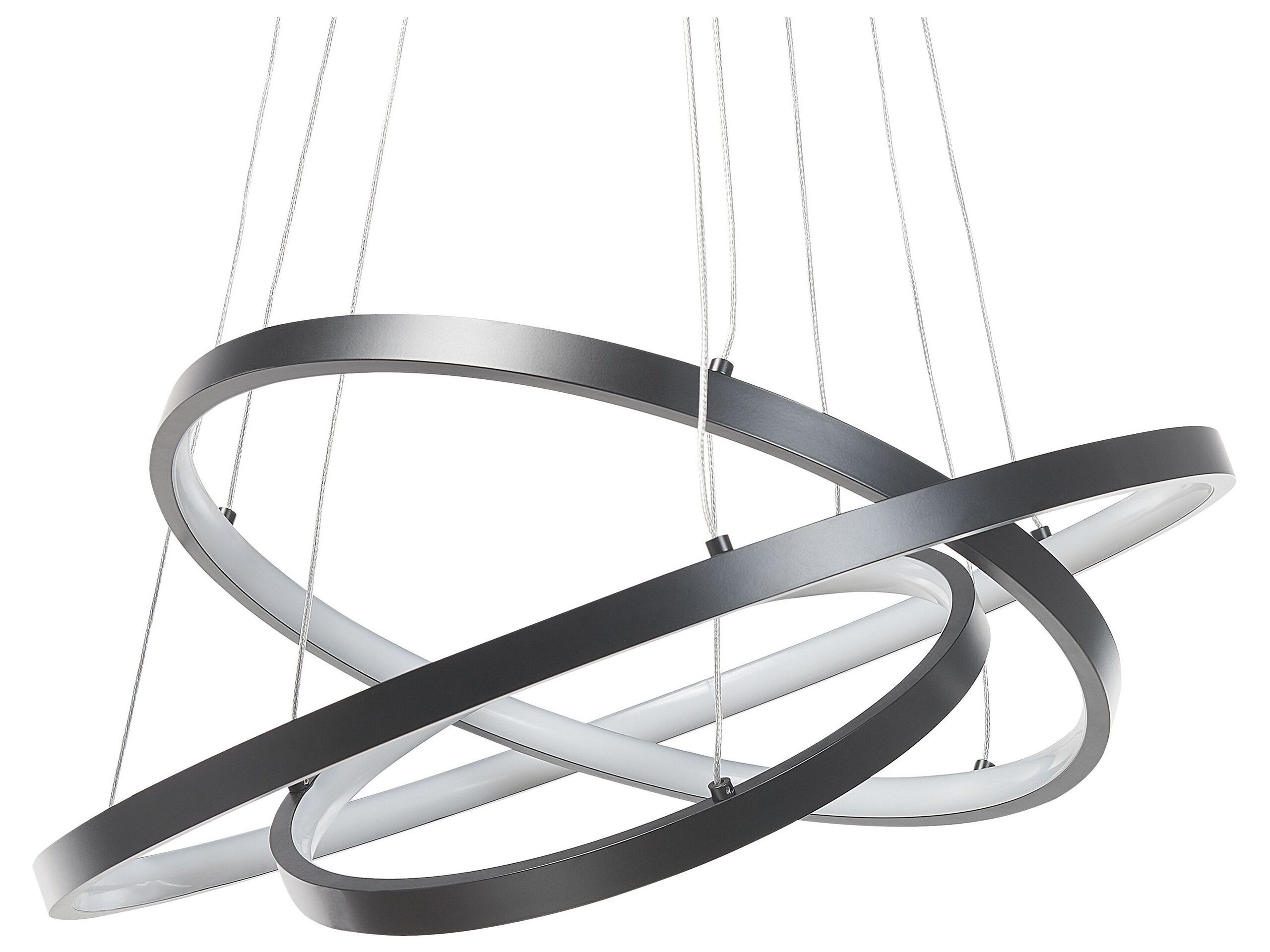 Upgrade your living or dining room with this splendid pendant lamp, simultaneously adding a glam flair to the interior. Lightweight, yet robust, the piece boasts a black finish that seamlessly blends in with a wide range of modern interiors. It consists of 3 rings, each of which can be hung differently by adjusting the cord length, so you can give the lamp an elaborate shape. Additionally, it comes with a LED light and a cap that complements the overall design of the piece. Details: Color: Black. Main material: Aluminium. Additional material: Iron, Silicone. Weight: 2 Assembly: Requires Installation