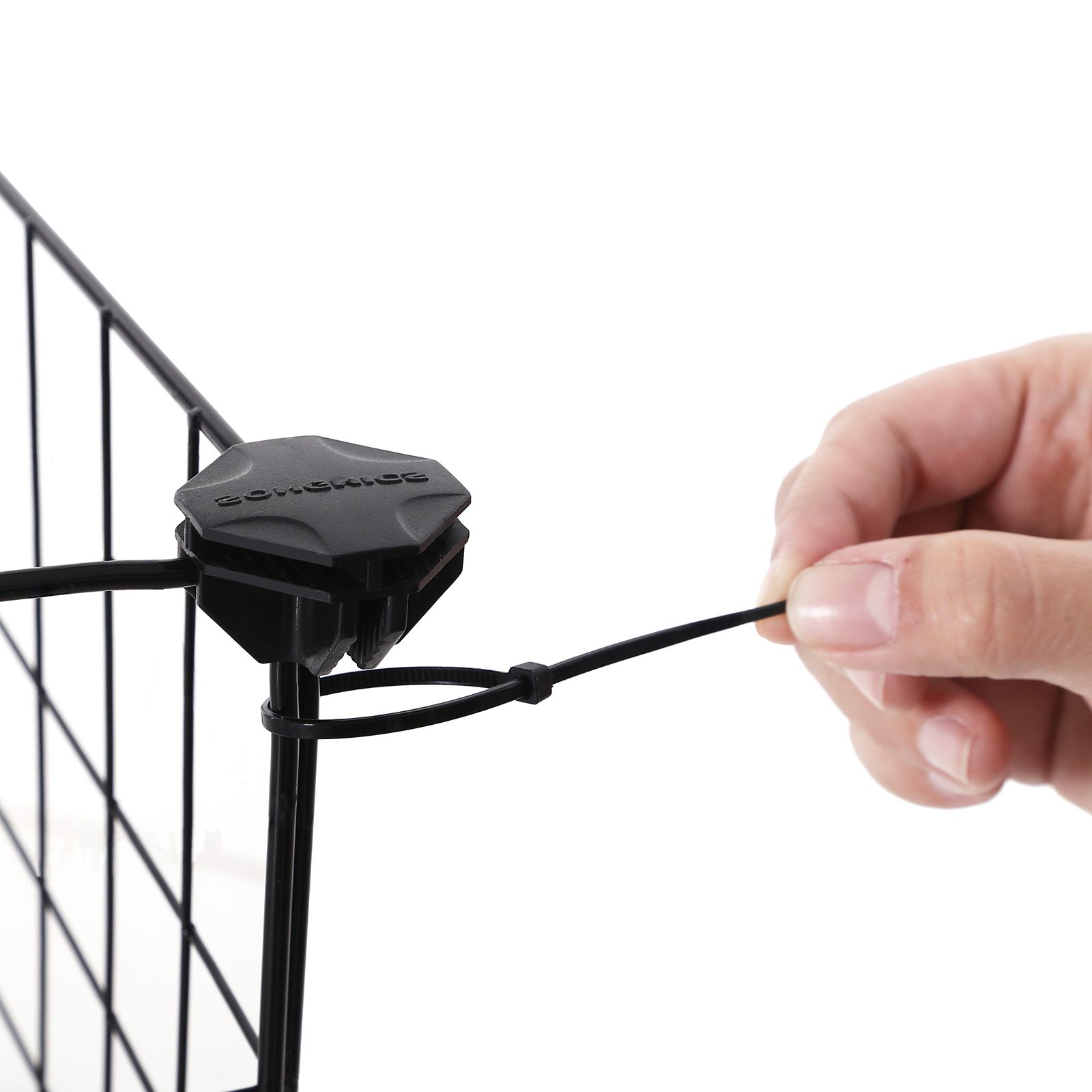 When pets feel pampered, they reciprocate by giving you their affection. Make your little friend feel loved even when you're not at home. Create a spacious area with this one-and-a-half-floor enclosure where your sweet friend can have fun and feel comfortable.Your Puppy is One of Us: We have created a fence that you can customize as you like. With 27 panels plus 1 wire mesh door (35 x 35 cm each) and 37 ABS plastic connectors, you can decide on different shapes by freely assembling them. Fill it with a few games, a cot and a bowl of water to create a kingdom where your animal can feel like a king.Safety for Him, Too: The advanced connectors are made of quality ABS plastic to keep the wire mesh panels stable. To increase firmness, 50 clamps are included to secure panels, so the fence can be moved without being disassembled.Make your little four-legged friend happy and create the home of his dreams with this fence!