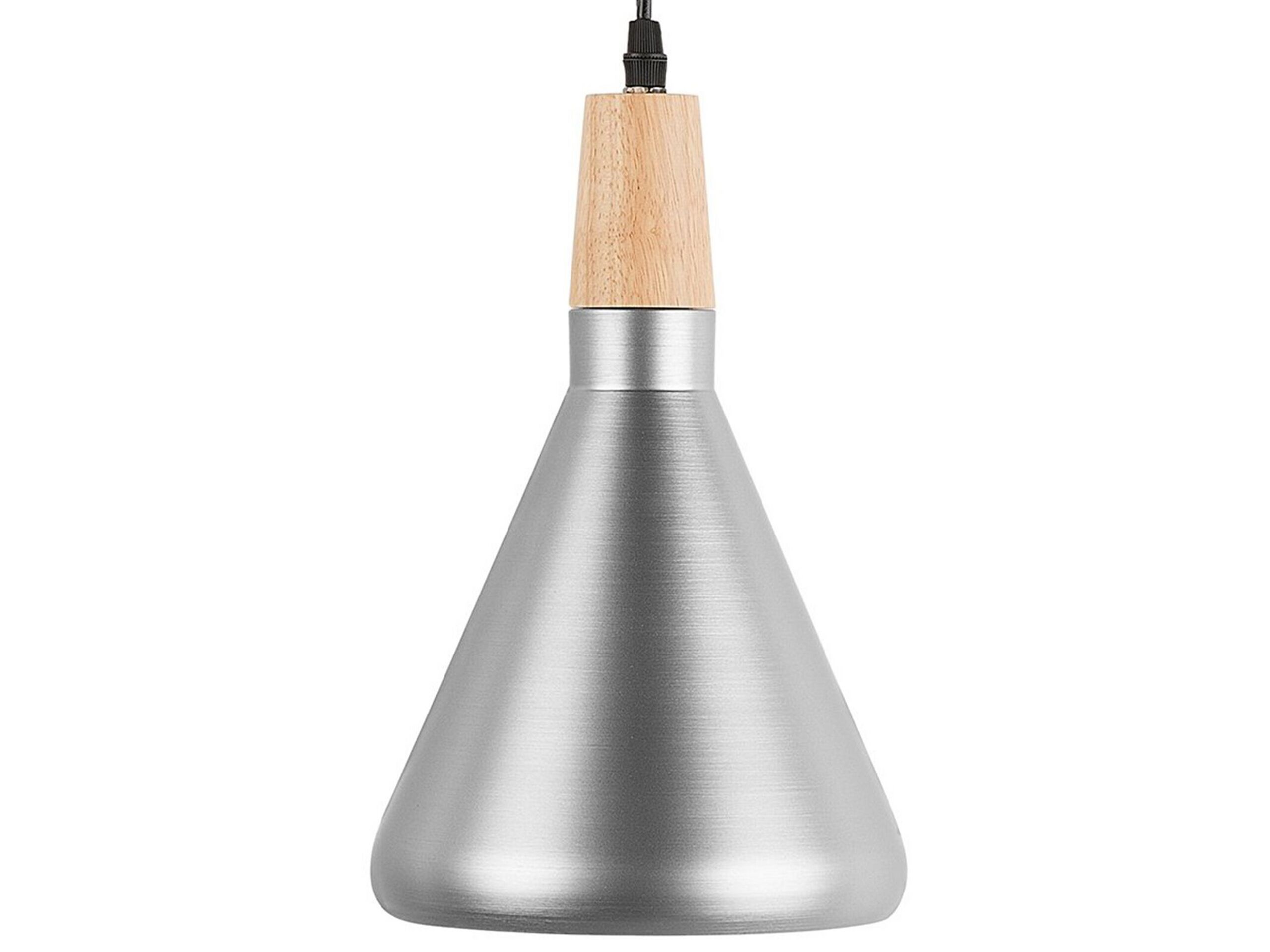 Bring a touch of glamorous elegance to your home. Sleek lines and minimalistic design combined with a metallic gloss finish make this lamp a perfect accent piece for modern or traditional interiors. The radiant silver cone is complemented by a light wood pendant holder for a classy Scandinavian touch. Whether hung over a dining table or a kitchen island, the lamp makes a stunning decoration, illuminating the room with a focused light perfect for any task. Details: Color: Silver, Light Wood. Main material: Metal. Additional material: Oak Wood, PVC. Weight: 1 Assembly: Requires Installation Wood type: Quercus variabilis Wood Origin: China