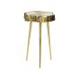 This stunning gold table is a perfect addition to any living room or bedroom. Crafted from high-quality metal, this furniture is both sturdy and stylish. The sleek and glossy gold finish gives it a luxurious feel, while the wood knot effect on the top adds a touch of natural beauty. The compact size makes it ideal for smaller spaces or as an accent piece alongside larger furniture. Details: Color: Gold. Main material: Aluminium. Additional material: Aluminium. Weight: 3 Assembly: Legs to be Fitted Weight Capacity: 25 Legs Height: 44