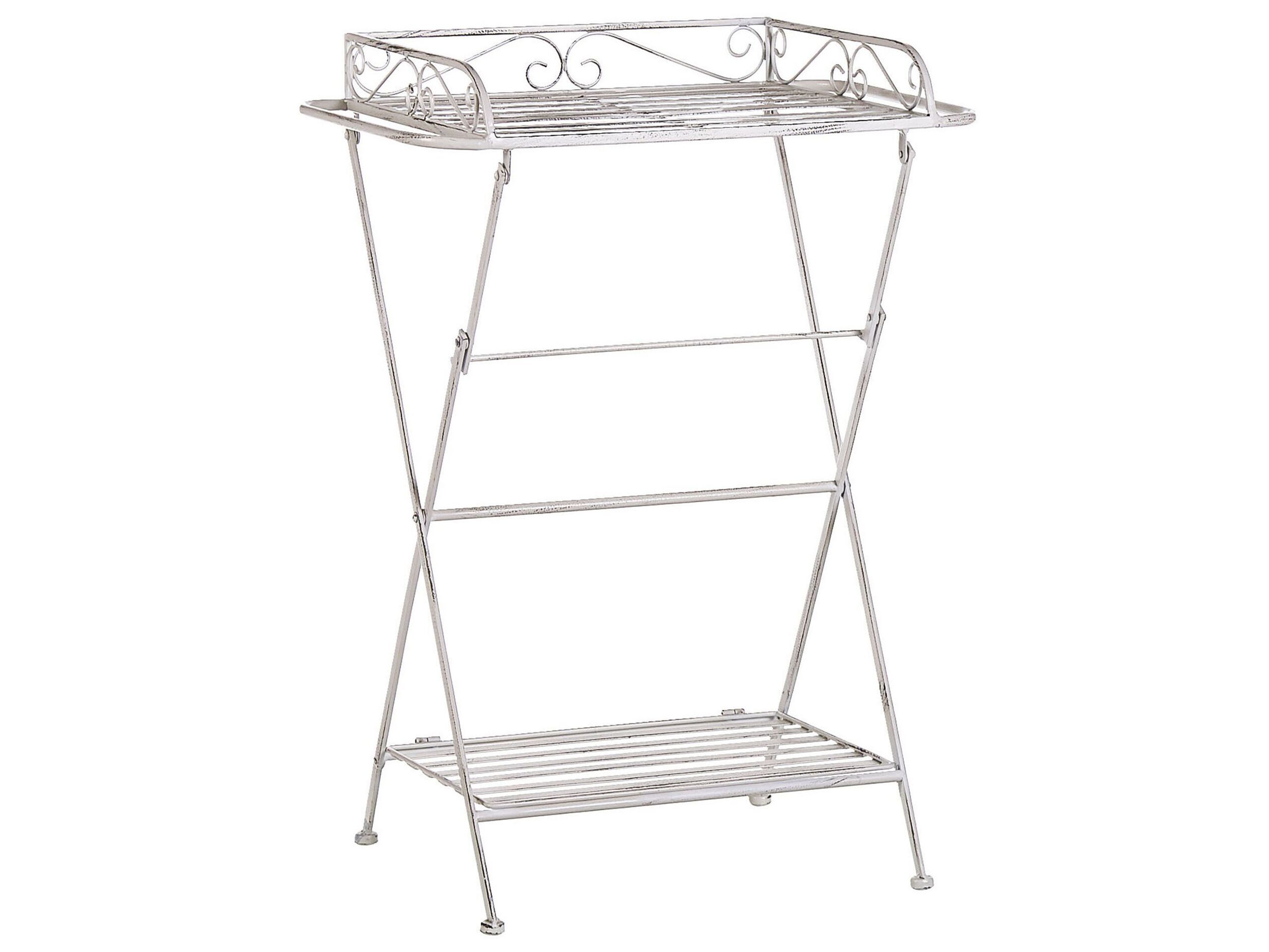 This side table is a splendid example of perfect balance between vintage appeal and glam charm. Made entirely from robust metal in white, distressed finish, it is light thanks to its characteristic construction. Beautifully decorated with curvaceous metalwork, it features an additional shelf for all kinds of decorative accessories or magazines. The piece can be folded for easy transport and storage. Details: Color: White. Main material: Iron. Additional material: Iron. Weight: 5.5 Assembly: Does Not Require Assembly Weight Capacity: 20 Legs Height: 66