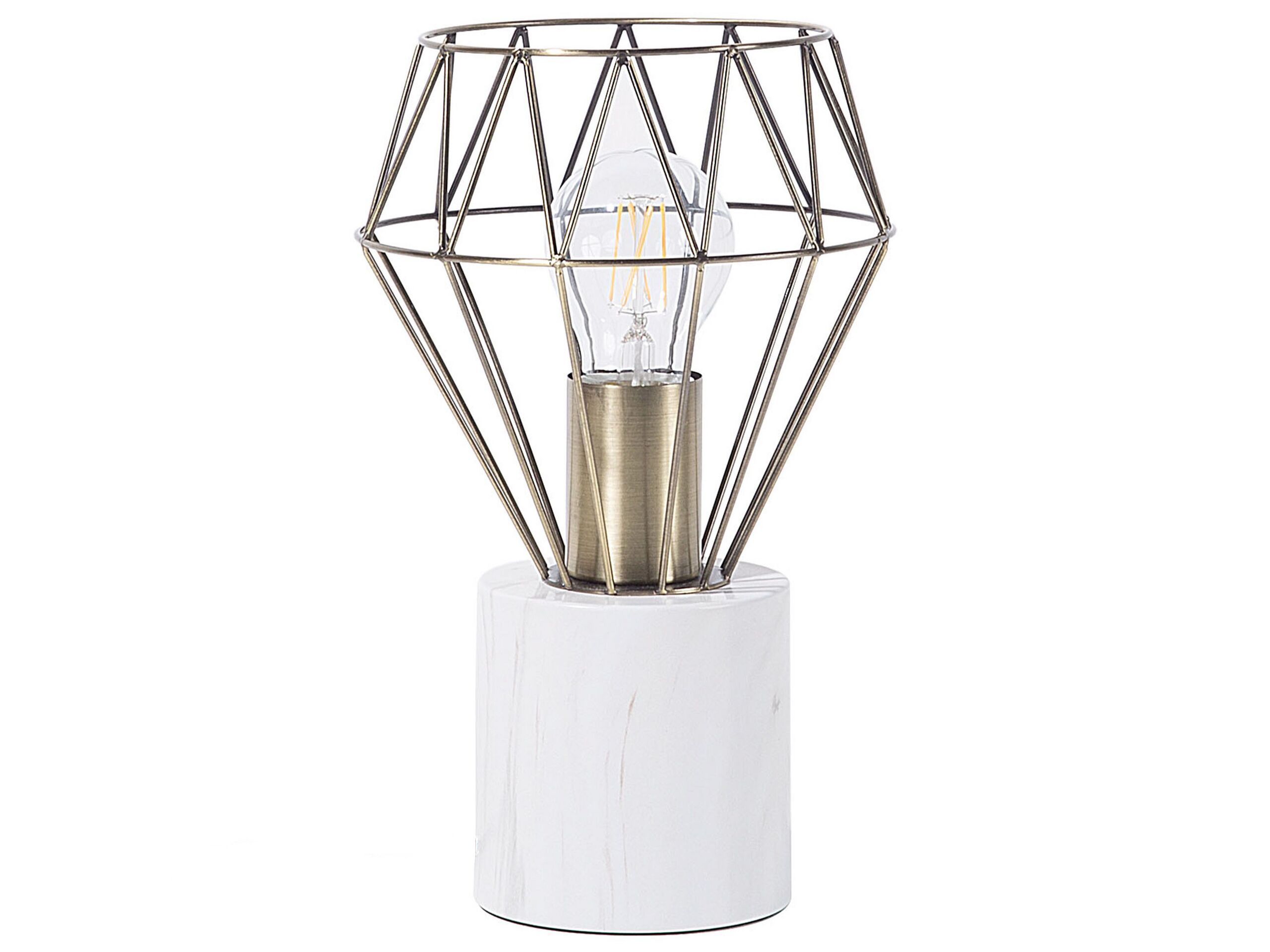 The unique ambient lamp is a perfect choice for any modern interior. Featuring a geometric frame made of brass metal in a trendy diamond shape and a delicate marble-like metal base with grey veins. Polished lines and glossy finish make it a great accent to any interior, while an exposed light bulb distributes bright, intense light that is ideal for reading or studying. Details: Color: Brass, White. Main material: Metal. Additional material: PVC. Weight: 1 Assembly: Does Not Require Assembly