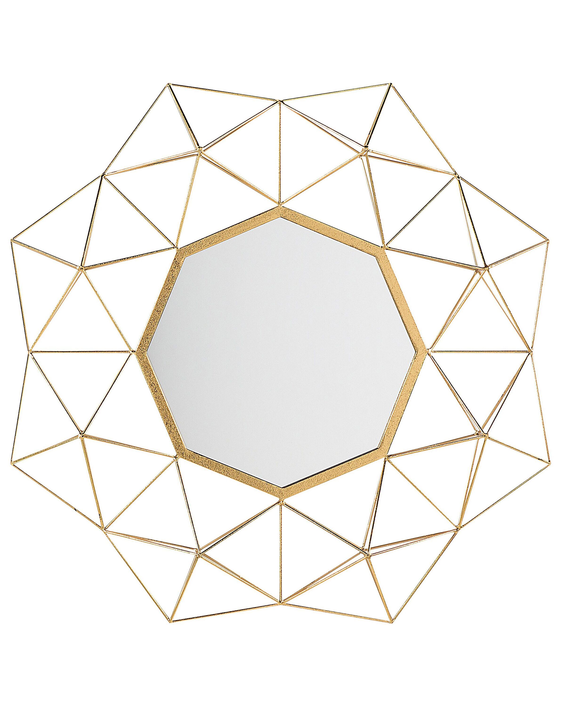 This mirror is a stunning wall statement piece that enriches any modern or traditional home décor. Featuring a gold frame in a dimensional, geometrical design it takes inspiration in retro and art deco forms. Perfect as a part of living area wall art, it can also be effectively styled in an entryway, or hanged above a dresser. Details: Color: Gold. Main material: Metal. Additional material: Glass. Weight: 4 Assembly: Does Not Require Assembly