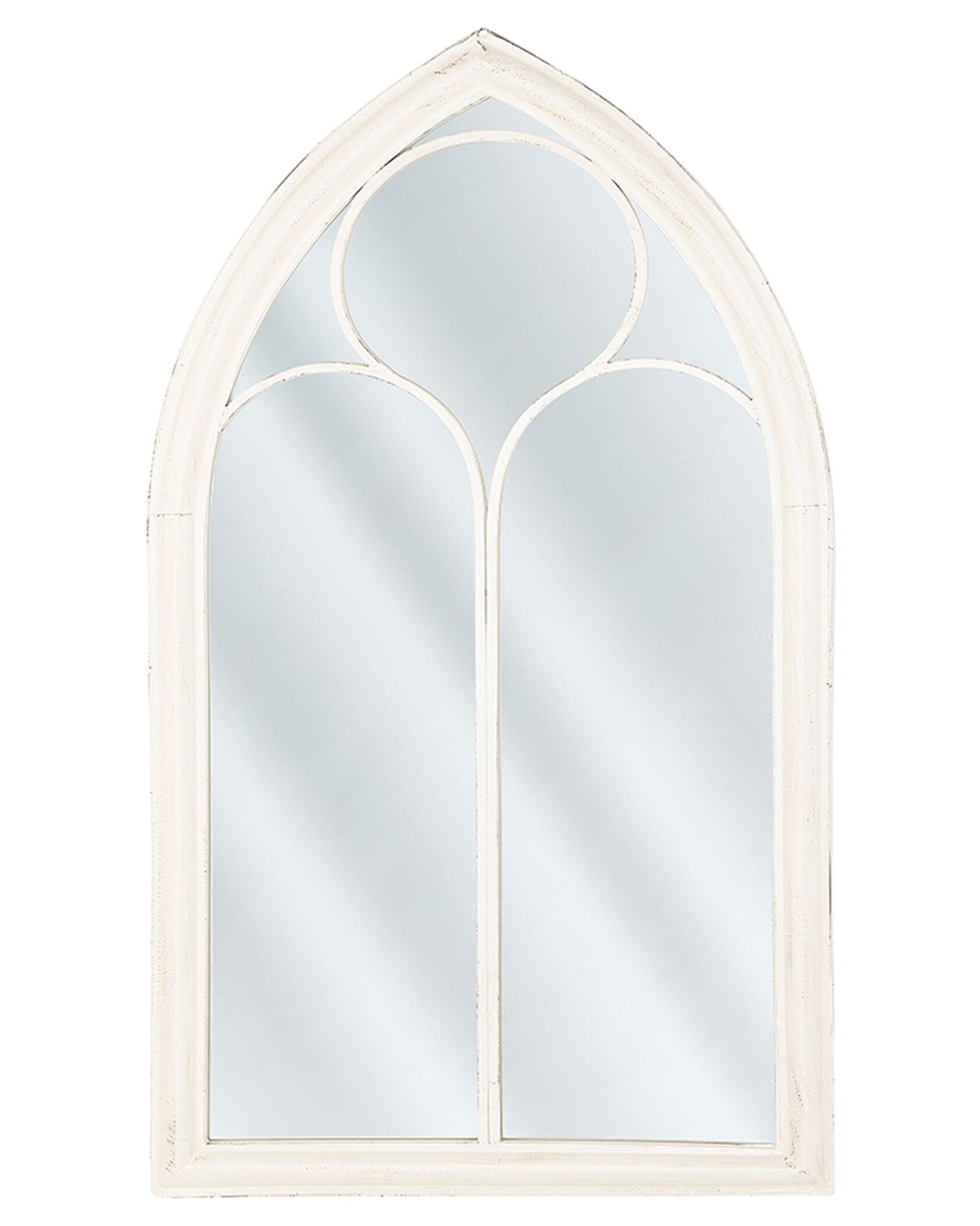 A stunning, decorative mirror made in an arched window design that instantly beautifies any setting. Its robust steel frame boasts a slightly distressed off-white finish that gives it a distinctive aged look. The piece would offset vintage style settings and work just as well in a more traditional or modern interior. Details: Color: White. Main material: Metal. Additional material: Glass. Weight: 9 Assembly: Does Not Require Assembly