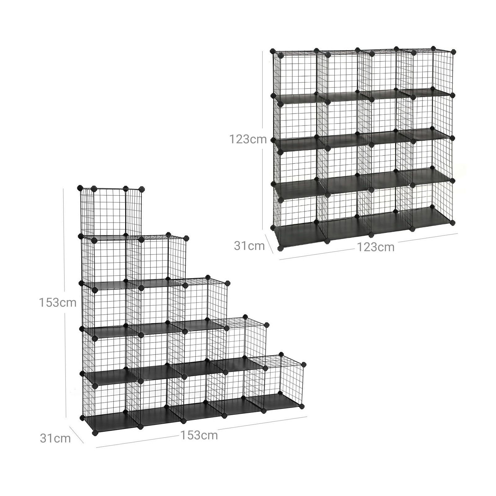 Descriptions:Everything fits in here...Use our metal wire storage cabinet for clothes, shoes, office supplies, books, magazines and... and you have 16 cubes and PP sheets at your disposal as cube bottom.Where it can stand...A shelving unit for every room with its grid setup. Very easy to fit in any room: living room, bedroom, nursery, hall, bathroom, basement, garage, etc. It should be protected from the weather such as sun, rain and wind, so you can enjoy it for long time.If you prefer something unusual (and you do not care about possible damage due to rain, sun, wind and earth contact), then you can also use the rack as a grid shelf for plants (without PP sheets). Anchor the shelf with pegs well in the ground and pay attention to a firm footing and possibly an additional connection with cable ties of the individual shelf parts (for wind & storm) and let climbing plants such as black-eyed Susanne, vetch or nasturtium grow on it - inside you still have a small shelf for decoration, etc. (The life of the shelf will thereby be significantly reduced).How it is put together...A comprehensive assembly instruction is included in the delivery (in 5 languages). Connect the wire mesh with plastic connectors. At each corner such a connector is mounted and wire plates are simply inserted. It is important to make sure that everything is well connected and the grids are "locked in place" and that nothing can be loosen. For this we also put a rubber mallet in the package, so you can knock together everything well.