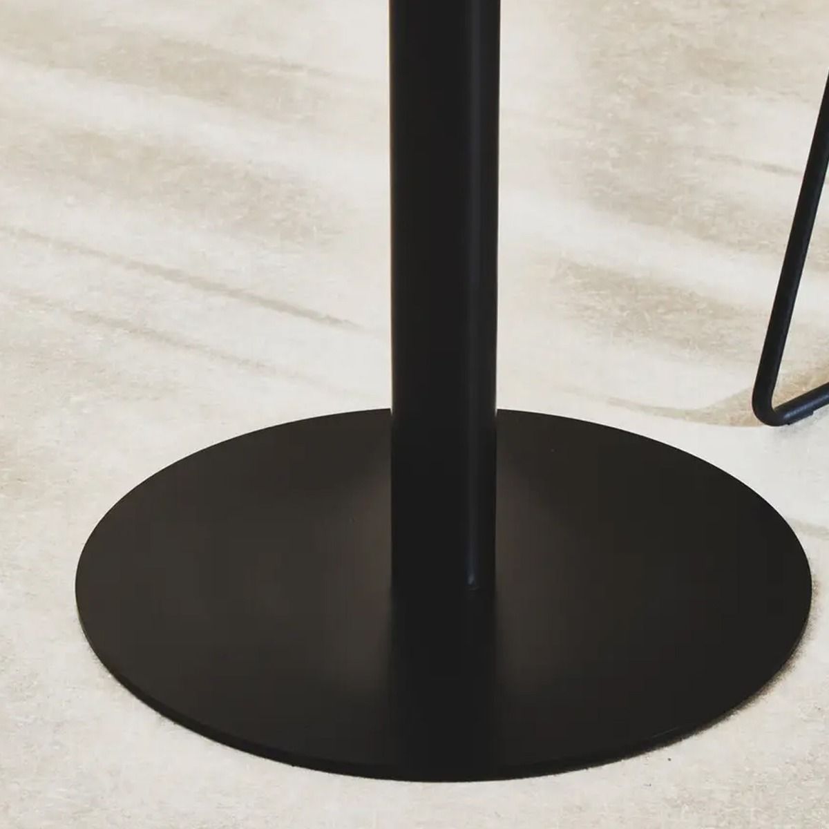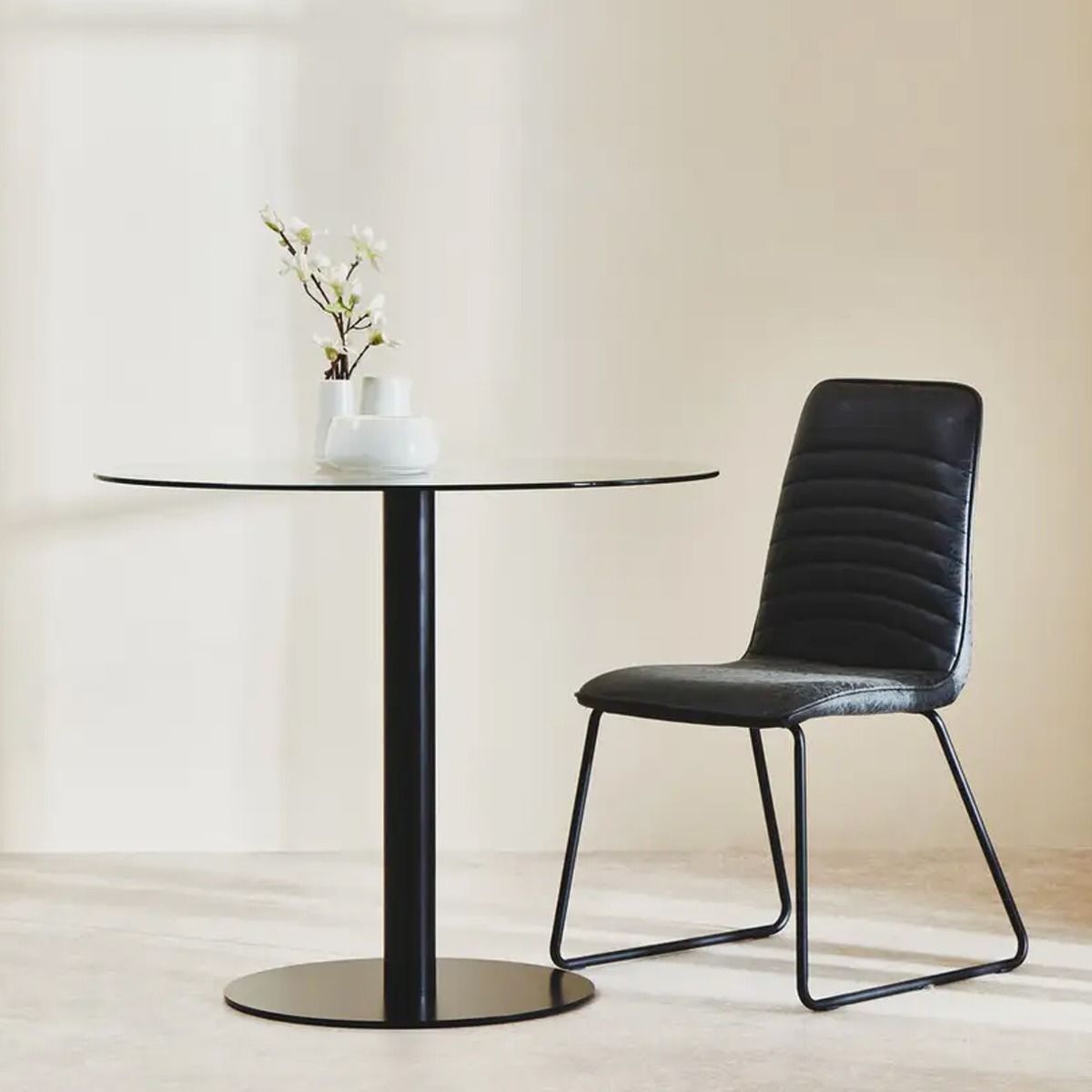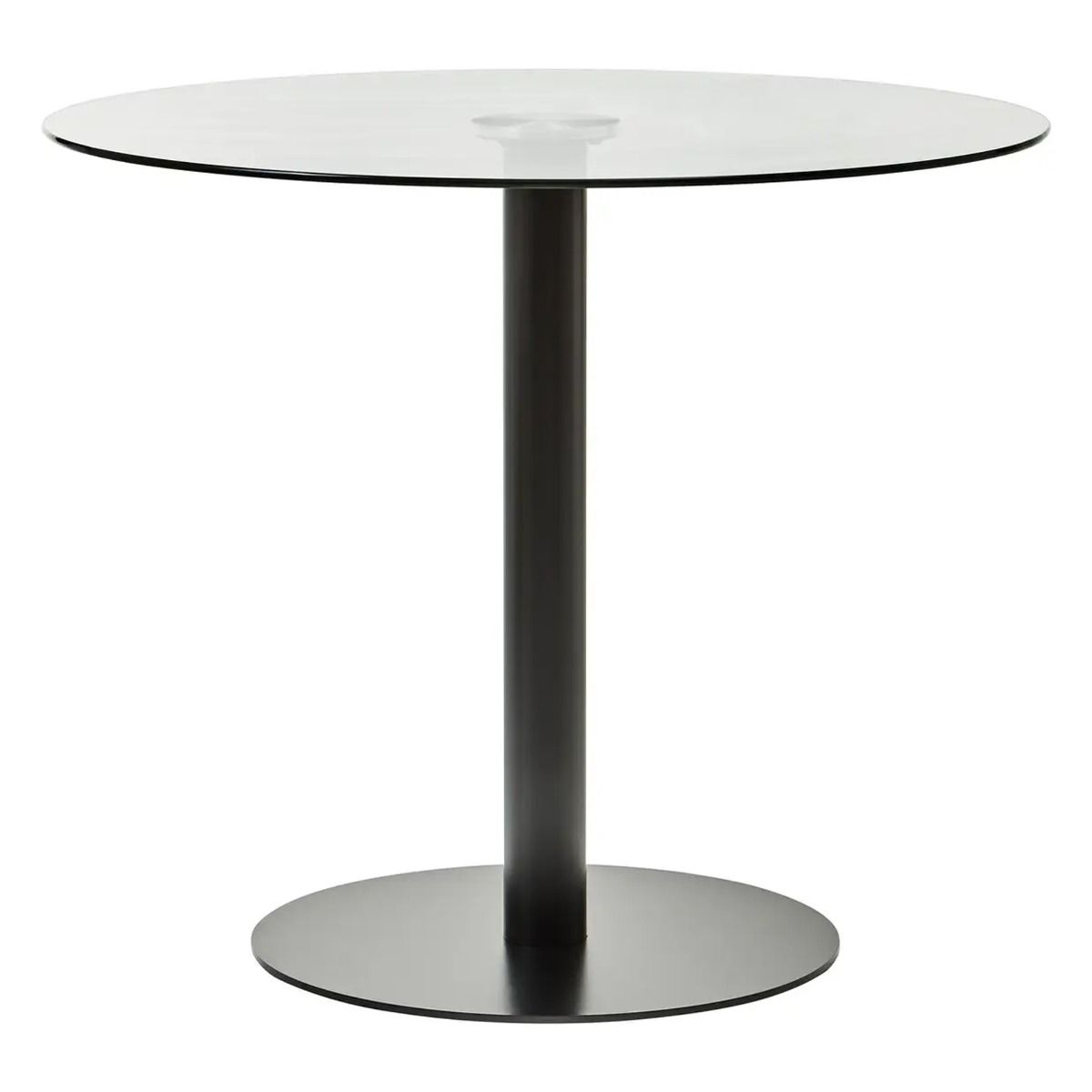 This dining table has a round glass top that gives it an elegant and contemporary look. Made from matte black metal, the sleek stand has a circular base that complements the tabletop and adds stability.