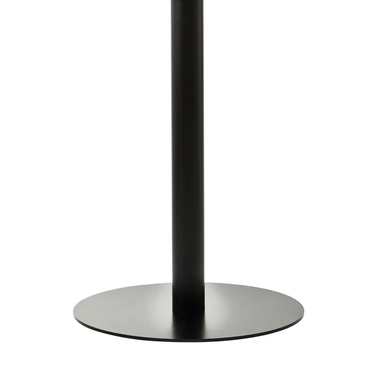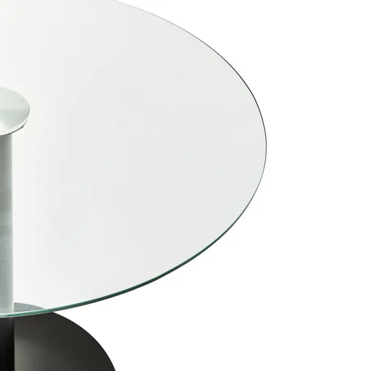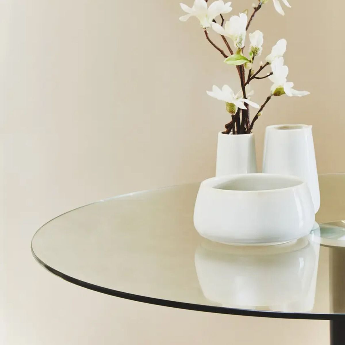 This dining table has a round glass top that gives it an elegant and contemporary look. Made from matte black metal, the sleek stand has a circular base that complements the tabletop and adds stability.