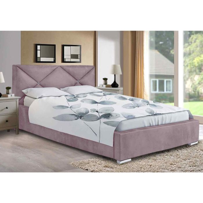 Another fabulous designer bed frame with a simple design on the headboard, 2 elegant diamantes placed with a simple design to give an outstanding look. Available in various plush velvet colours, comes with solid wooden slats