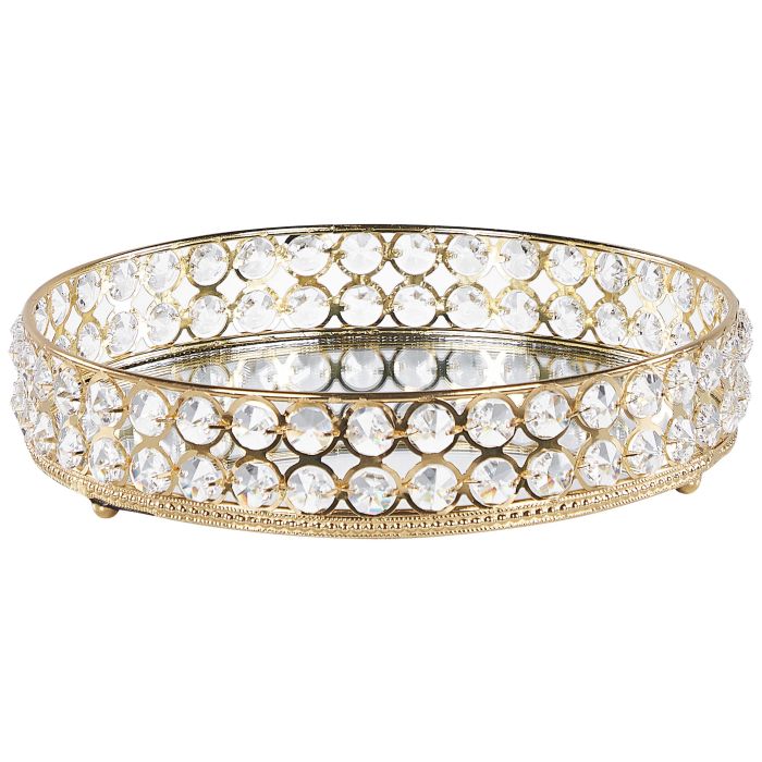 This chic tray is a practical yet decorative accessory for any glam interior. Crafted from metal, it features shining glass rhinestones and a mirrored bottom that beautifully reflects the surroundings. The tray is lightweight, so you can easily move it from one place to another. Use it in your bedroom to store jewellery and other trinkets, or in your living room as a stylish accent piece. Details: Color: Gold. Main material: Iron. Weight: 1 Assembly: Does Not Require Assembly