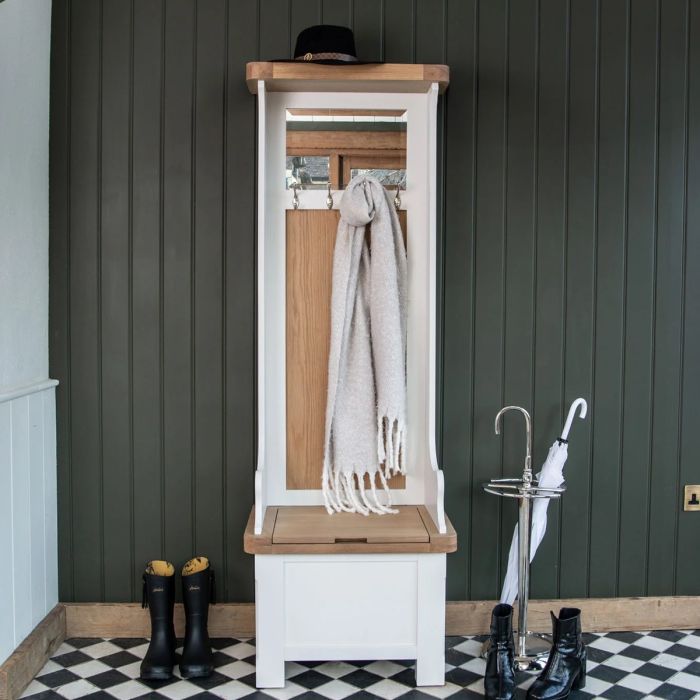 Mirrored Hallway Tidy with Shoe Storage Bench and Oak Top - White