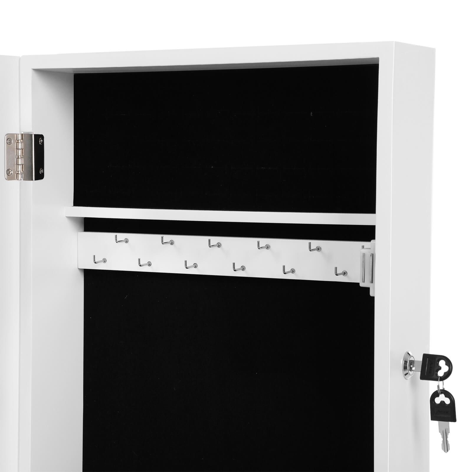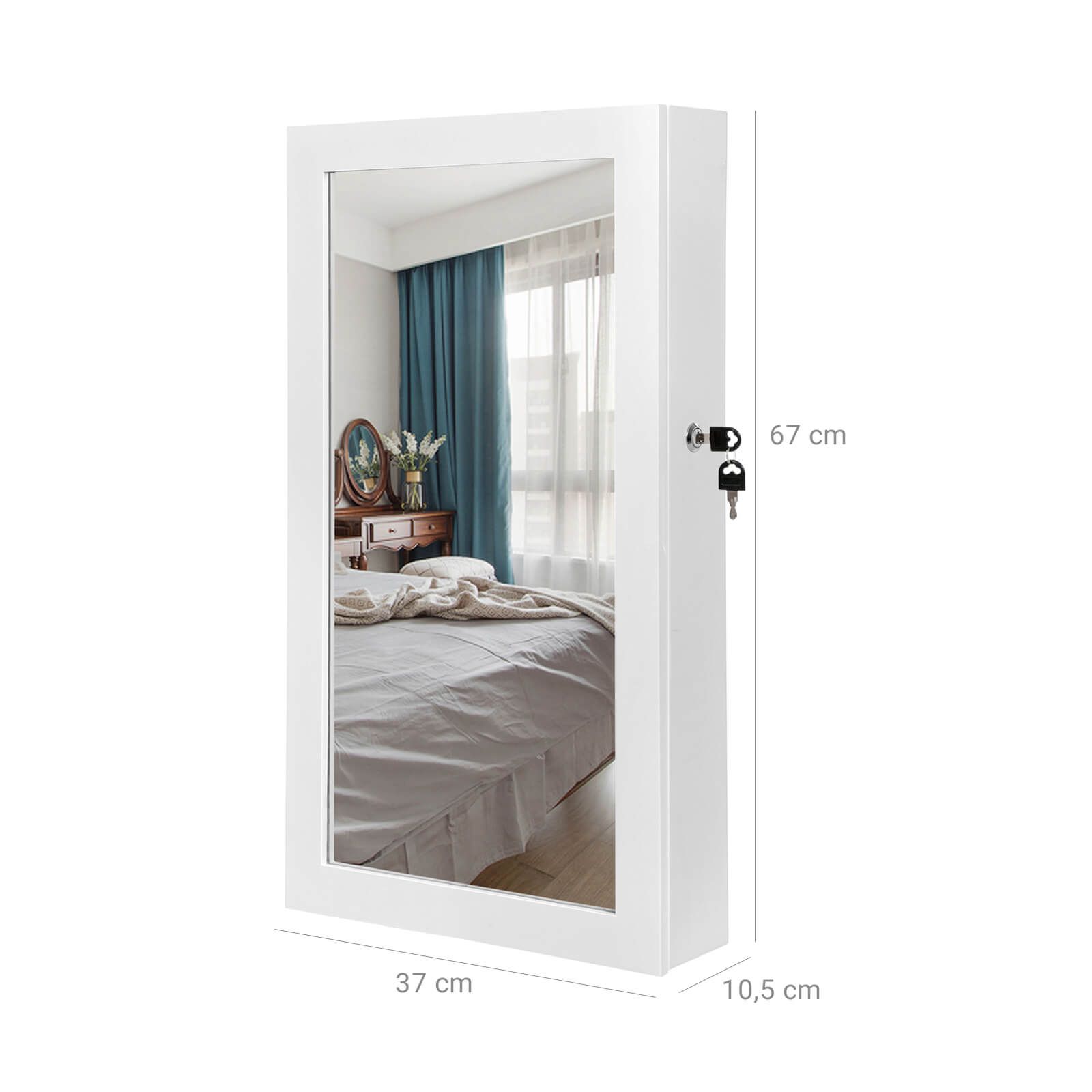 special jewelry cabinet with diversifying use must meet your different needs. With the generous and elegant looking, it is perfect to put in bedroom or dressing room. With 2 interlayers, 60 ring frames, 52 earring hooks, 24 earring jack studs, 24 necklace hooks, it has large capacity to orderly store your items. Safety guarantee with side door lock and 2 keys. So white wall/door-mount mirrored jewelry cabinet is an ideal for your to organize your jewelry and beauty items.Note:- Fragile, please handle it carefully and prevent breaking mirror due to cabinet tilting.Product Parameters:- Dimensions: 37 x 10.5 x 67 cm (W x D x H)- Mirror size: 29 x 59 cm (D x H)