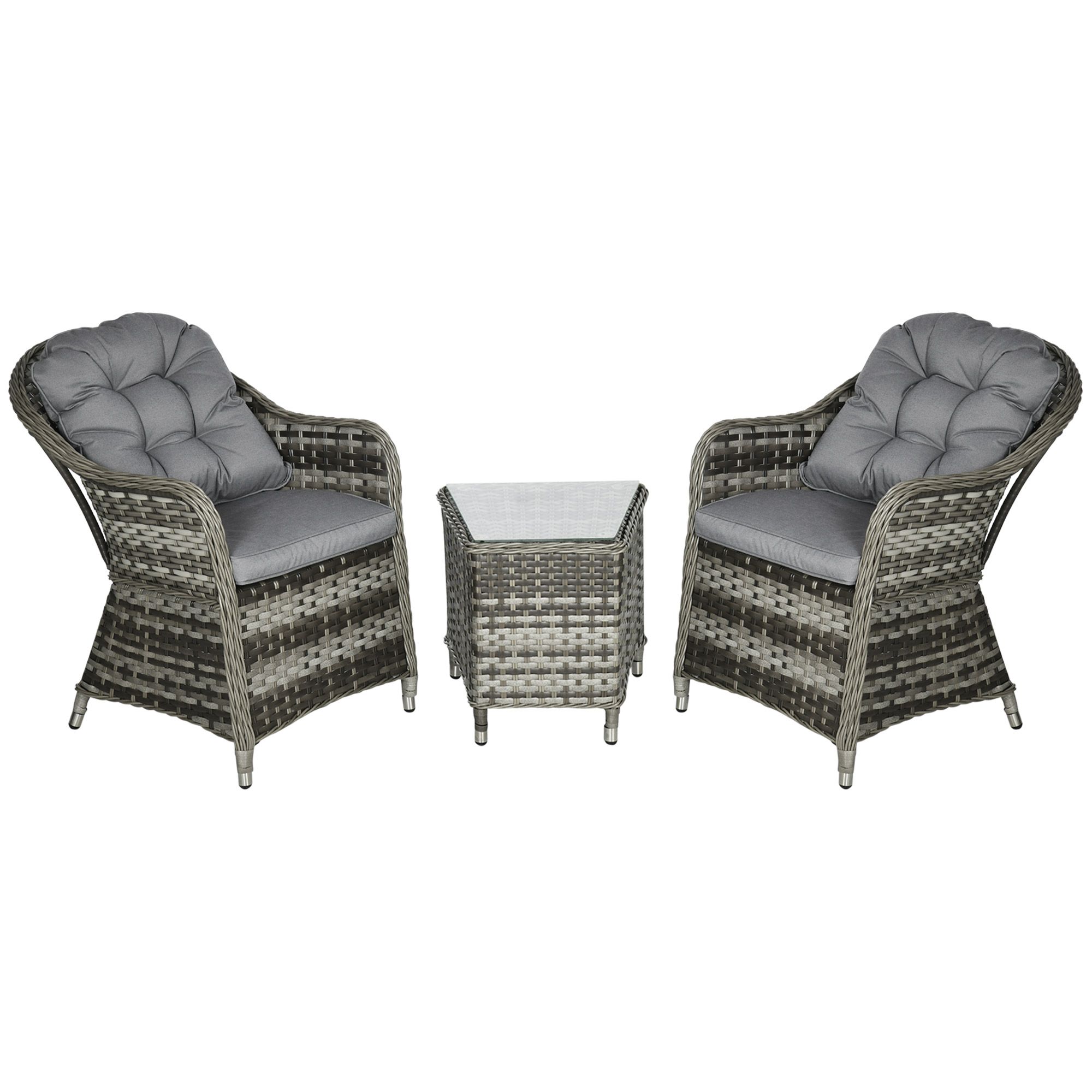 Modern 3 PCS Rattan Bistro Set, Patio Aluminium Balcony Furniture with Soft Cushions & Glass Top Table for Garden, Backyard, Grey