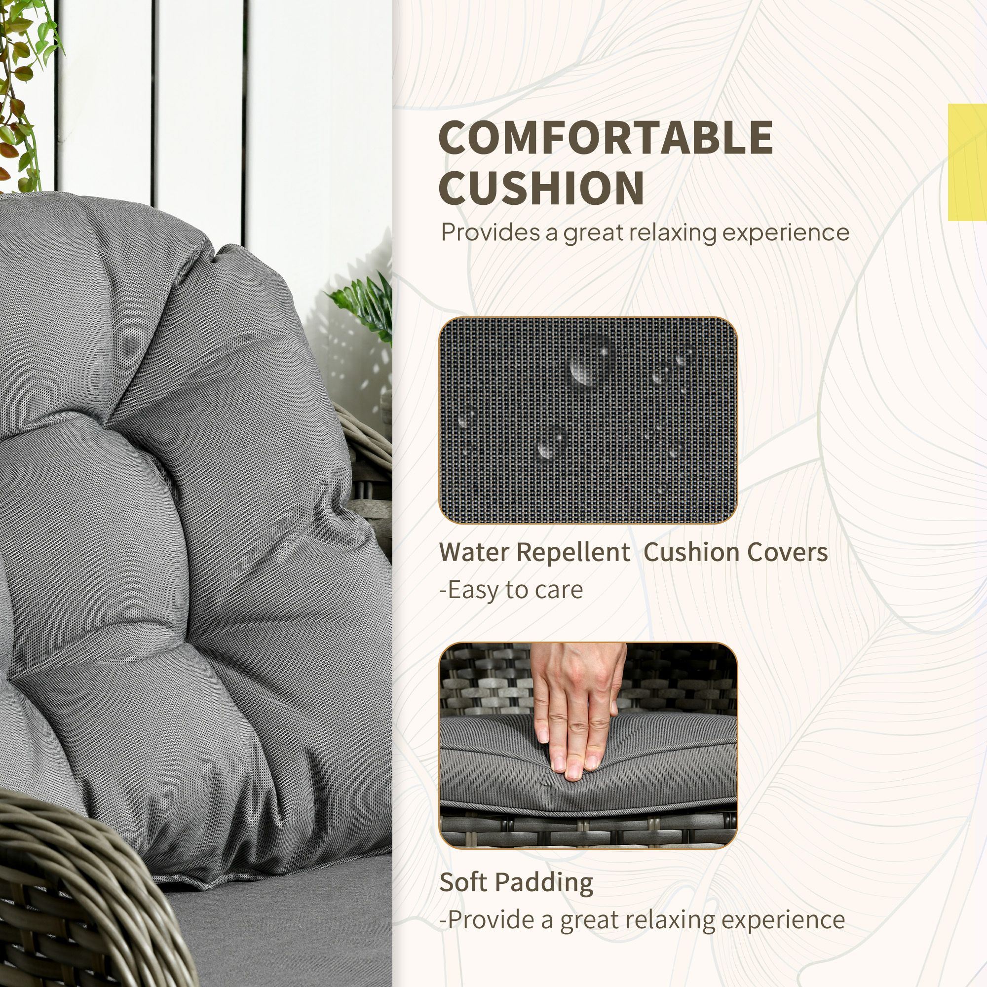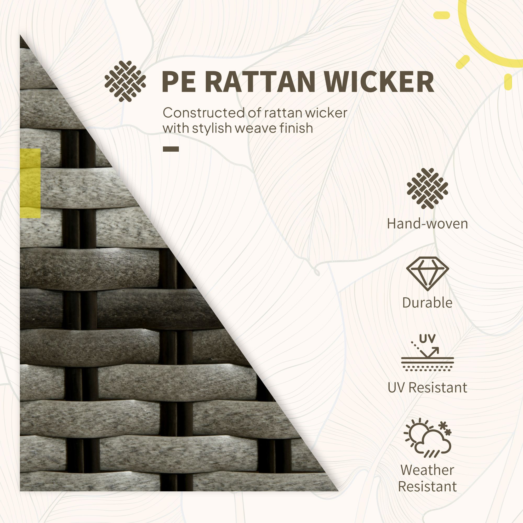 - Aluminum frame: Our rattan garden sets is made of lightweight aluminum frame with a powder-coated finish, and wrapped with high-quality mixed round and flat PE wicker making it sturdy, durable, stylish, easy to clean, and resistant to UV and light water damage.