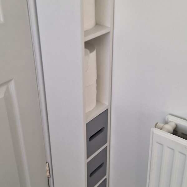 - Mixed storage: This narrow bathroom organiser features three open shelves and three compartments with doors. Plenty of room to organise bathroom essentials.