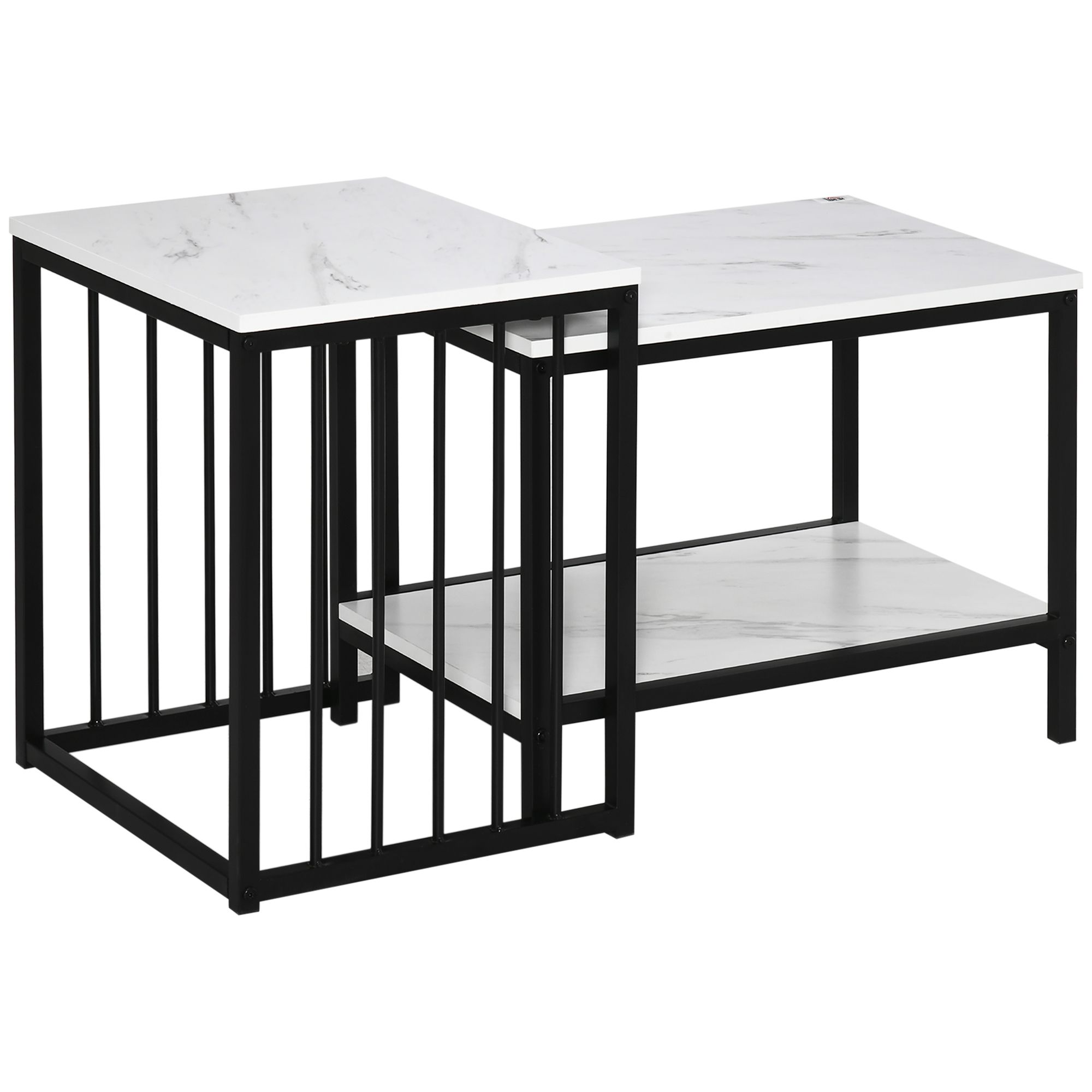 Modern Coffee Table Set of Two, Marble-Effect Nest of Tables with Steel Frame for Living Room, White and Black