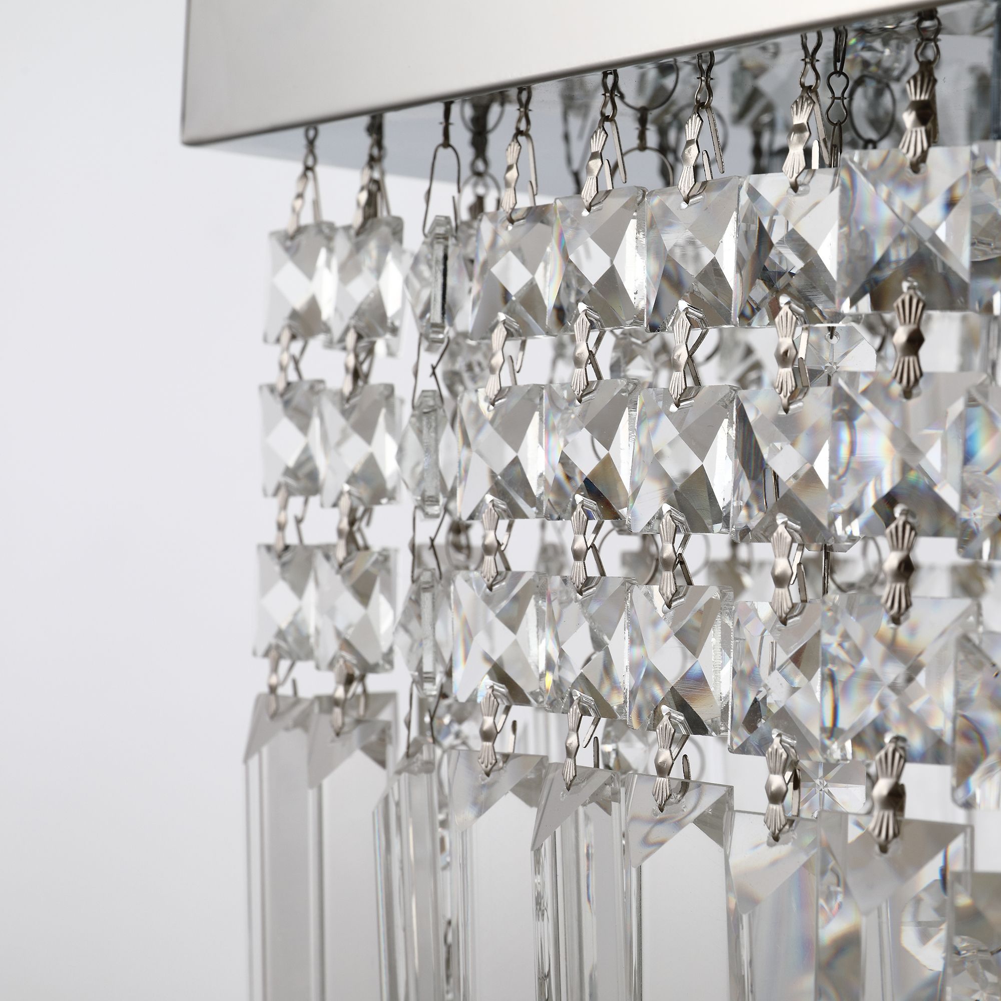 - ELEGANT STYLE: The simple square appearance reflects modernity. Made of 80 strings of triangle crystals and 60 strings of crystal balls, sparkling like transparent raindrops and lighting the room.