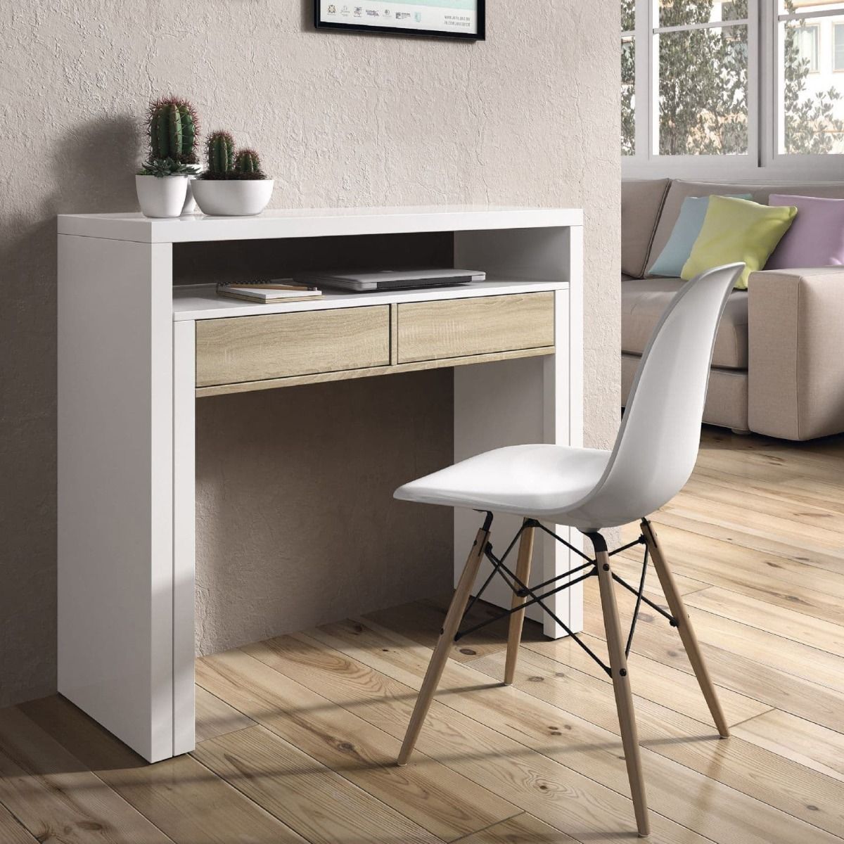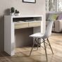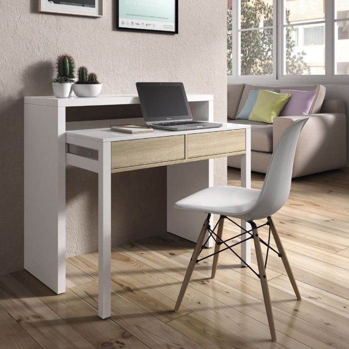 Introducing our versatile White and Oak Desk, seamlessly doubling as a dressing table or console table to suit your needs. Crafted with a charming combination of white and oak, this piece exudes contemporary elegance. Its functionality is enhanced by two drawers on smooth metal runners, offering ample storage for your essentials. With reversible legs for customizable style and easy assembly with its flat-packed design, this desk is the perfect blend of form and function for any space.