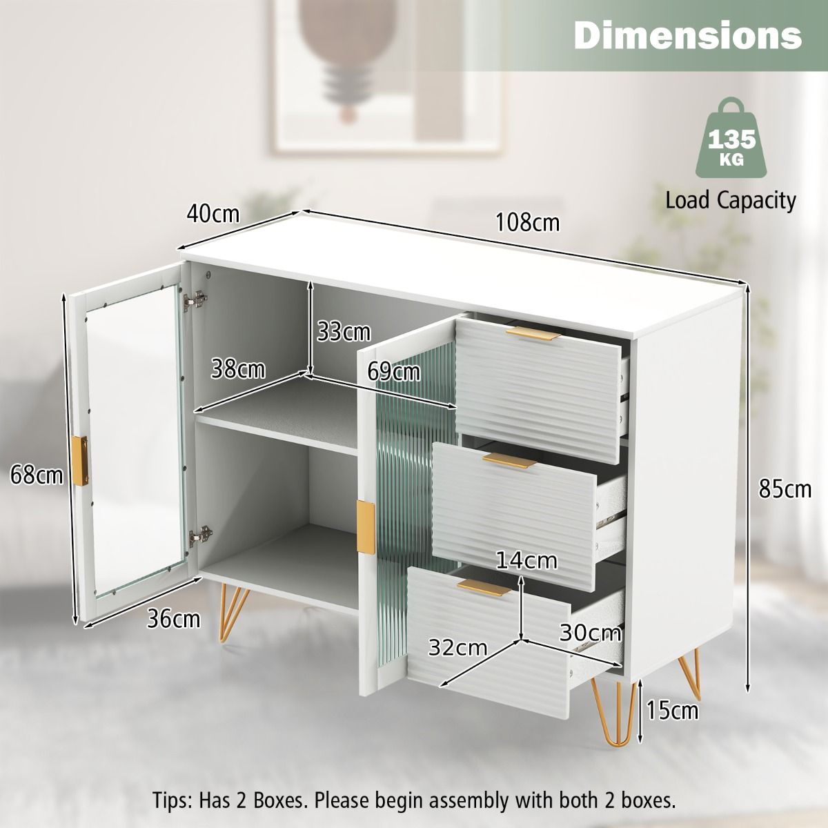 Modern Sideboard Storage Cabinet with 2 Glass Doors and 3 Drawers-White