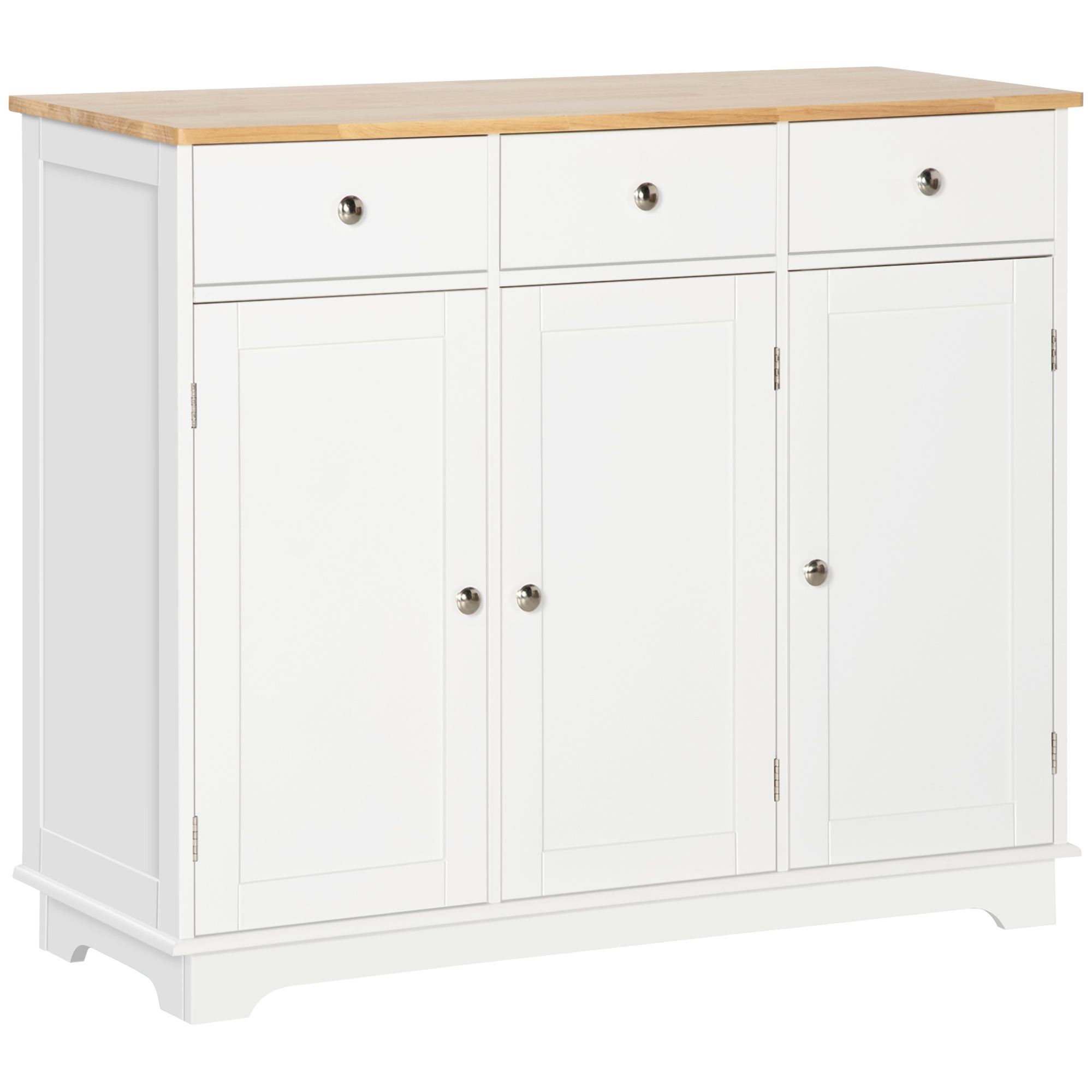 Modern Sideboard with Rubberwood Top, Buffet Cabinet with Storage Cabinets, Drawers and Adjustable Shelves for Living Room, Kitchen, White