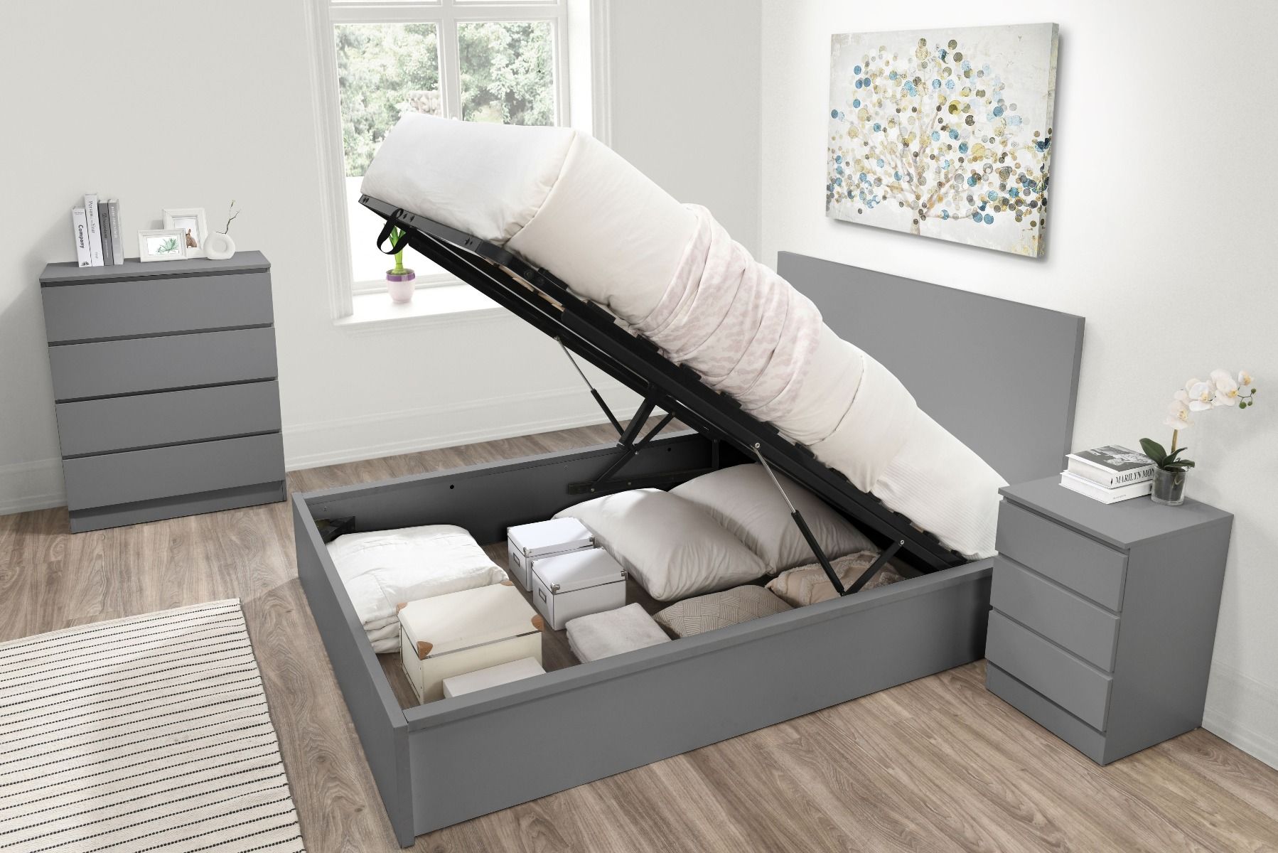 Modern & sleek the Oslo range is bedroom furniture with a streamlined design. It's simple design and minimal grooved handles has a sleek finish that pairs perfectly with any contemporary décor. The Oslo ottoman bed provides both class and practicality, with an opening base that provides plenty of storage. This frame has a sprung slatted base to give natural bounce, adjusting to where pressure is most exerted to provide greater comfort. Available in a choice of colours the Oslo range is ideal to accompany any bedroom.