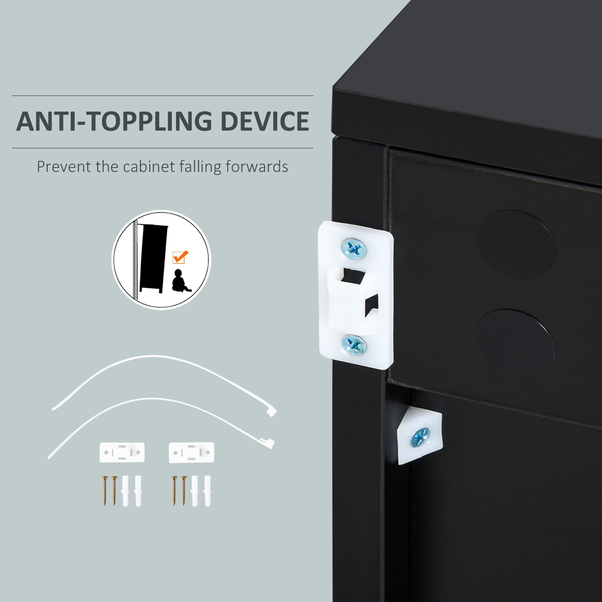 - Push-click-open doors for convenience• Durable particle board structure with safe anti-tipping straps