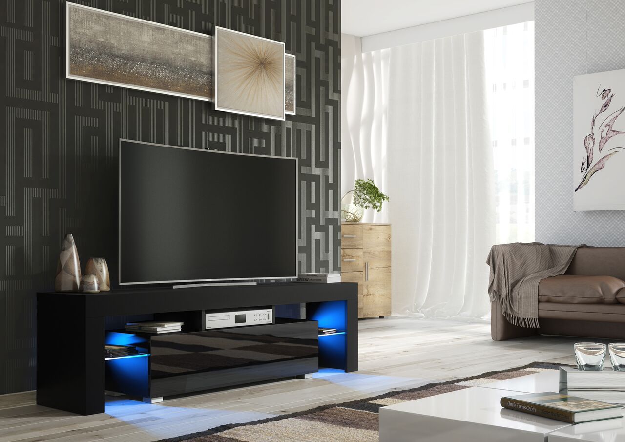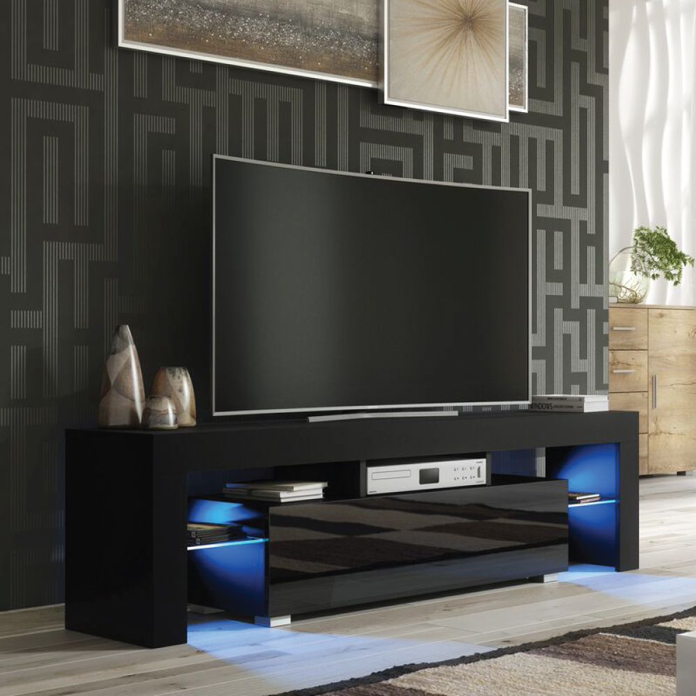 Modern TV Unit Cabinet Stand with Gloss Doors Free LED and Ample Storage 160cm - Black