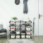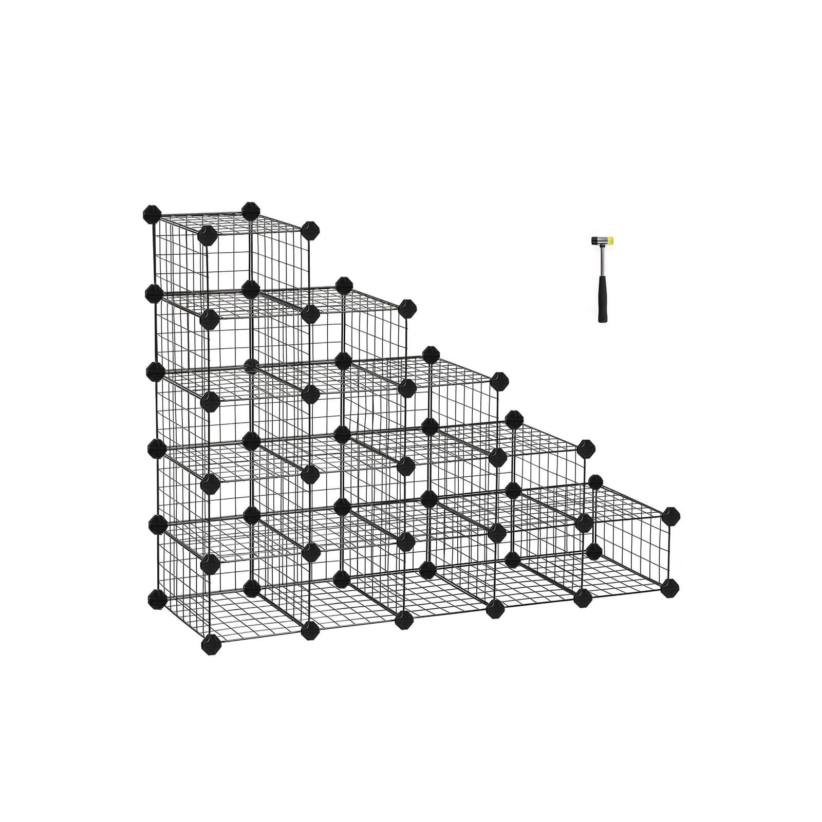 Descriptions:Everything fits right here...Each metal wire cube with a low profile is built to be stronger than larger cubes, perfect to keep men's, women's and kid's shoes; you can also use our metal grid storage organiser for clothes, toys, books, tools, etc. You will have all 16 cubes conveniently at your disposal.Where it can stand...A shelving unit for every room with its interlocking setup. Very easy to fit in living room, bedroom, nursery, hall, bathroom, basement or garage. It should be protected from the weather such as sun, rain and wind, so you can enjoy it for long time.How it is put together...A comprehensive assembly instruction is included in the delivery (in 5 languages). Connect the metal wire meshes with plastic connectors, at each corner such a connector is mounted and mesh sheets are simply inserted. It is important to make sure that everything is well connected and the meshes are "locked in place" and that nothing can be loosen. For this we also put a rubber mallet in the package, so you can knock together everything well.Convenient and PracticalMetal wire shoe rack can be assembled into different shapes to fit exactly what you need. Several units can be combined together for more storage and possibilities; you can also remove a shelf to create a taller space for boots. This unit offers you a creative and unique space.