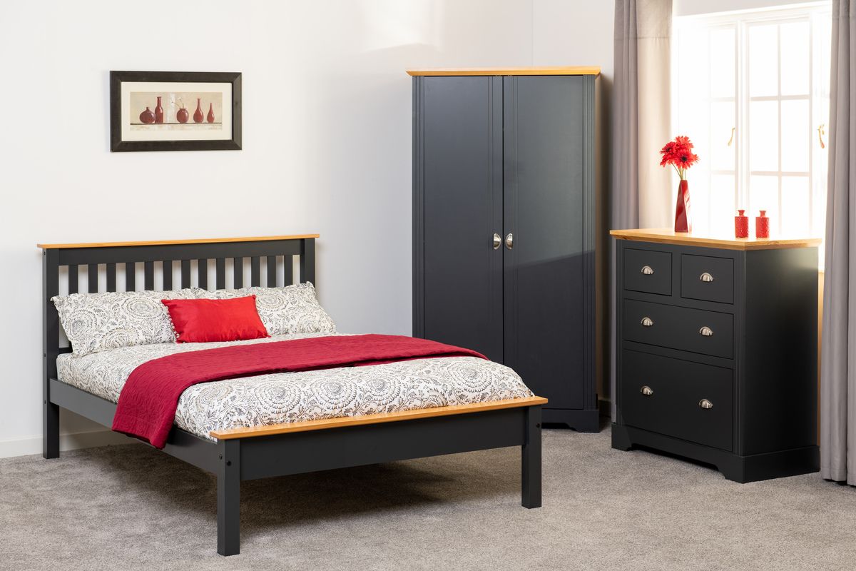 The Monaco 4'6" Bed with Low Foot End in Grey/Oak Effect finish offers a stylish and sturdy furniture solution. Constructed from MDF and pine slats, it features a robust construction, comfortable design, and 13 slats with a centre support leg for added stability. With its grey and oak effect finish, it adds a touch of modernity and elegance to any bedroom. Home Done Furniture offers a large stock of this range, ensuring timely delivery and installation.
