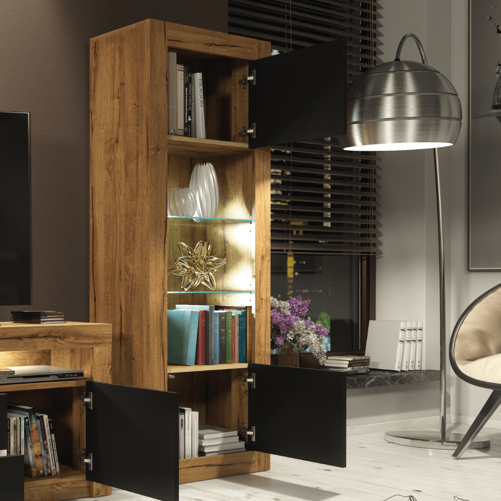 The MONACO Display Cabinet adds a touch of modern sophistication to your home, offering a tall and elegant storage solution designed to complement any contemporary interior. Measuring 63cm (W) x 170cm (H) x 35cm (D), this stylish piece balances form and functionality, making it a standout addition to your living space. The matte-finished body is paired with sleek, glossy doors, creating a clean and refined look that enhances any room. Two push-to-open doors provide ample hidden storage space, offering a discreet solution for organizing everyday items, while three open shelves above offer versatile options for displaying decor, books, or media accessories. Please note: the Oak with Black version features matte black doors, providing a unique and understated alternative to the glossy finishes available in other color options. Available in White & Gloss Doors, White & Grey Gloss Doors, Black & Gloss Doors, Walnut & Black Gloss Doors, Oak & White Gloss Doors, Oak & Black Matt Doors, and Dark Grey & Gloss Doors.