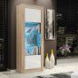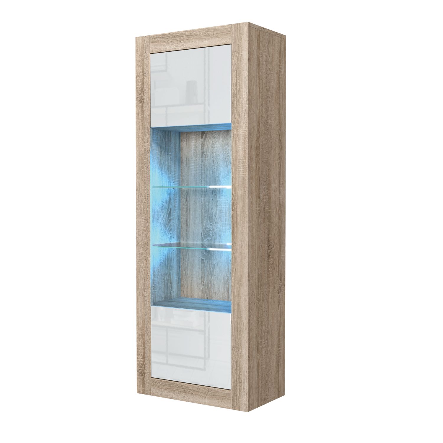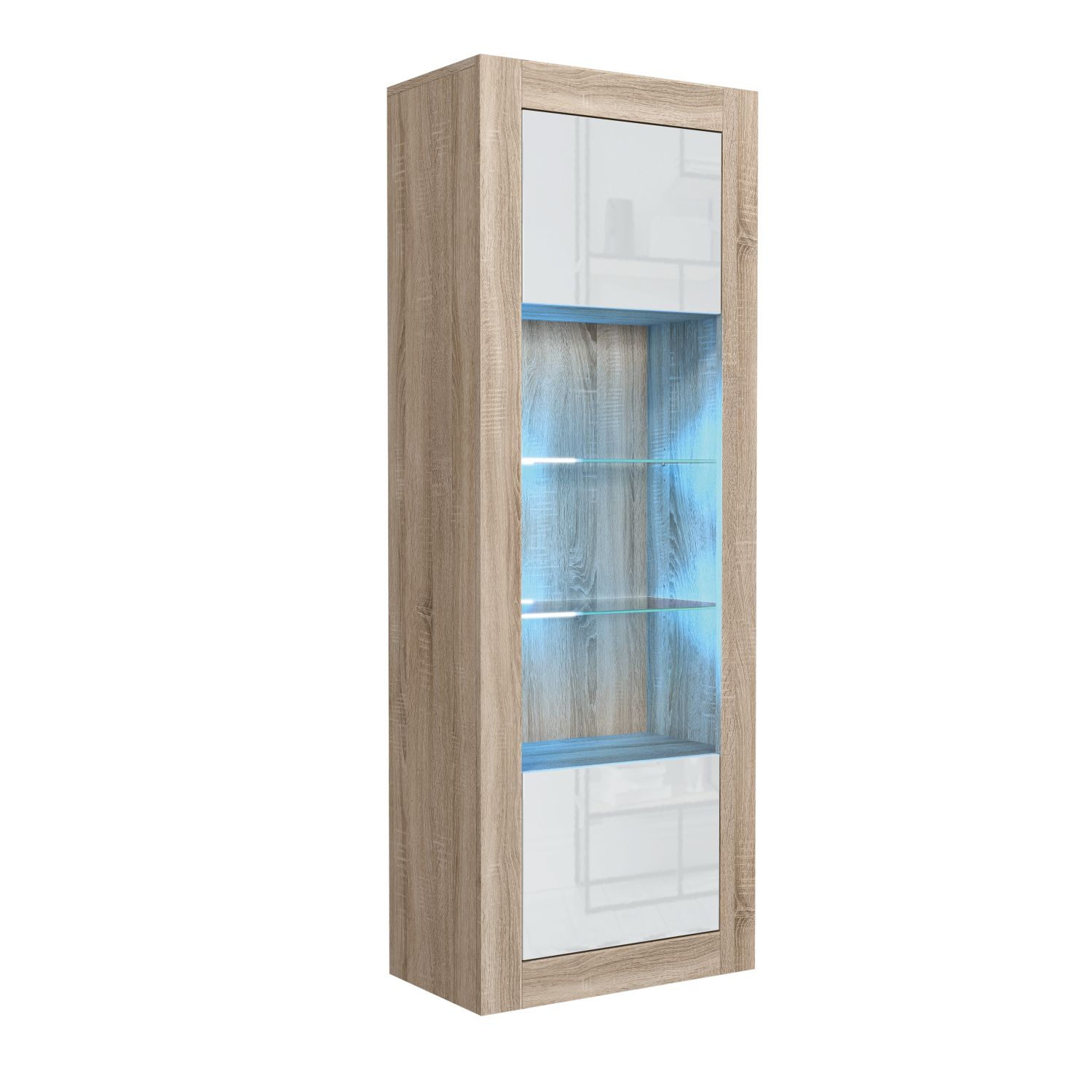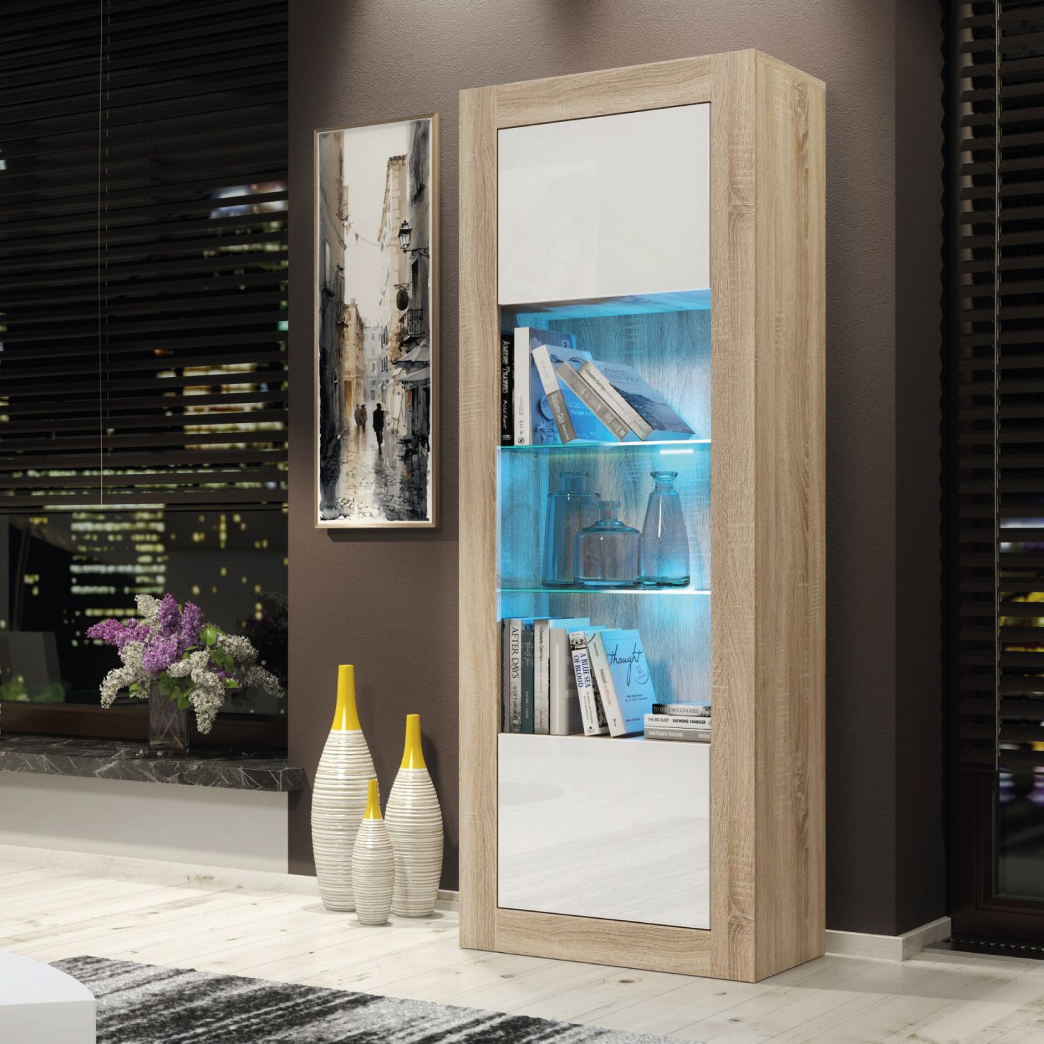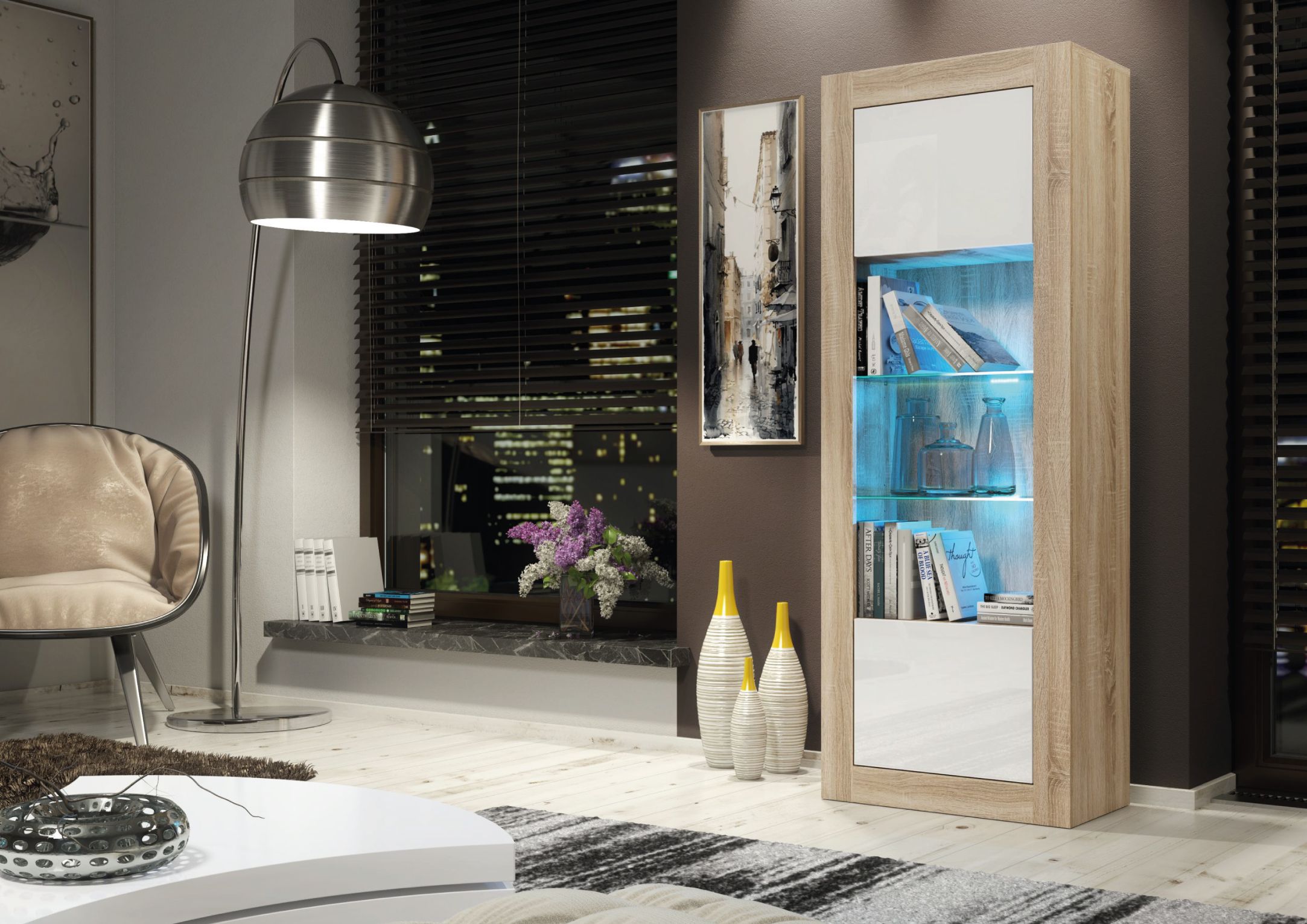 The MONACO Display Cabinet adds a touch of modern sophistication to your home, offering a tall and elegant storage solution designed to complement any contemporary interior. Measuring 63cm (W) x 170cm (H) x 35cm (D), this stylish piece balances form and functionality, making it a standout addition to your living space. The matte-finished body is paired with sleek, glossy doors, creating a clean and refined look that enhances any room. Two push-to-open doors provide ample hidden storage space, offering a discreet solution for organizing everyday items, while three open shelves above offer versatile options for displaying decor, books, or media accessories. Please note: the Oak with Black version features matte black doors, providing a unique and understated alternative to the glossy finishes available in other color options. Available in White & Gloss Doors, White & Grey Gloss Doors, Black & Gloss Doors, Walnut & Black Gloss Doors, Oak & White Gloss Doors, Oak & Black Matt Doors, and Dark Grey & Gloss Doors.
