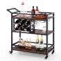MONEAN 3-Tier Bar Cart Serving Cart w/Wine Racks and Glass Holders-Rustic Brown