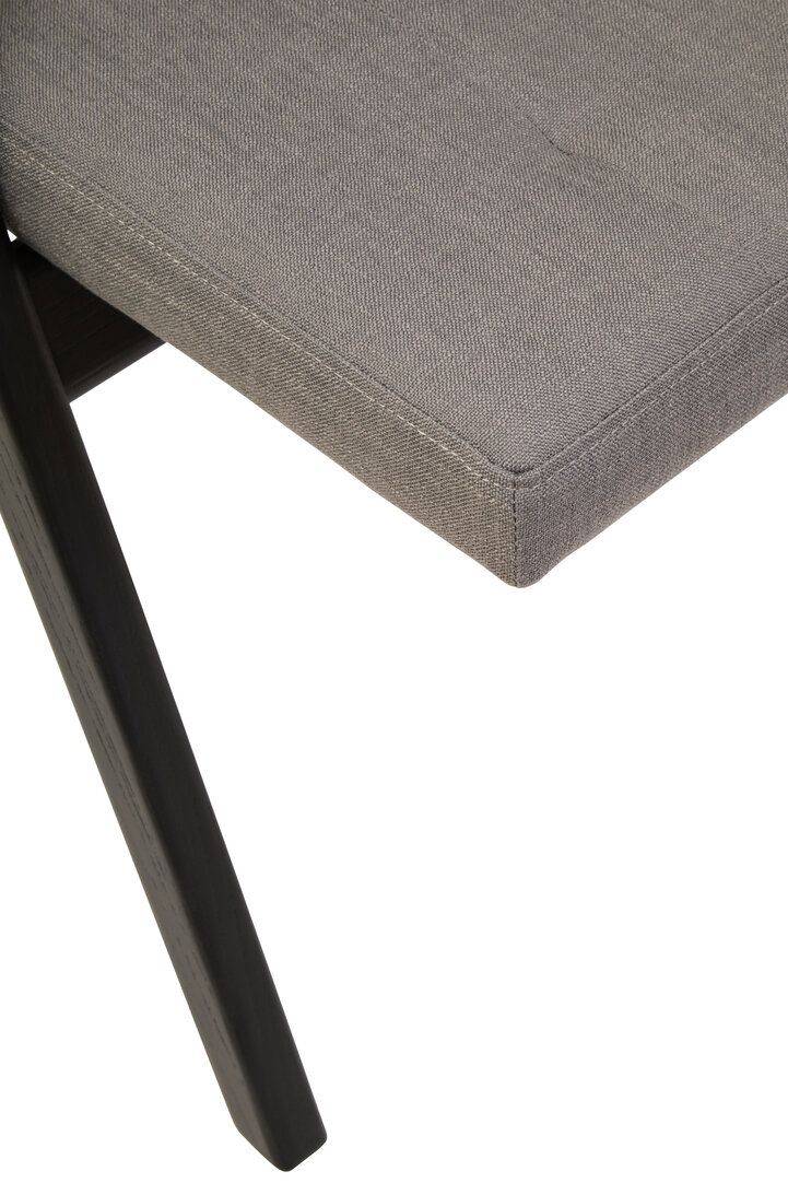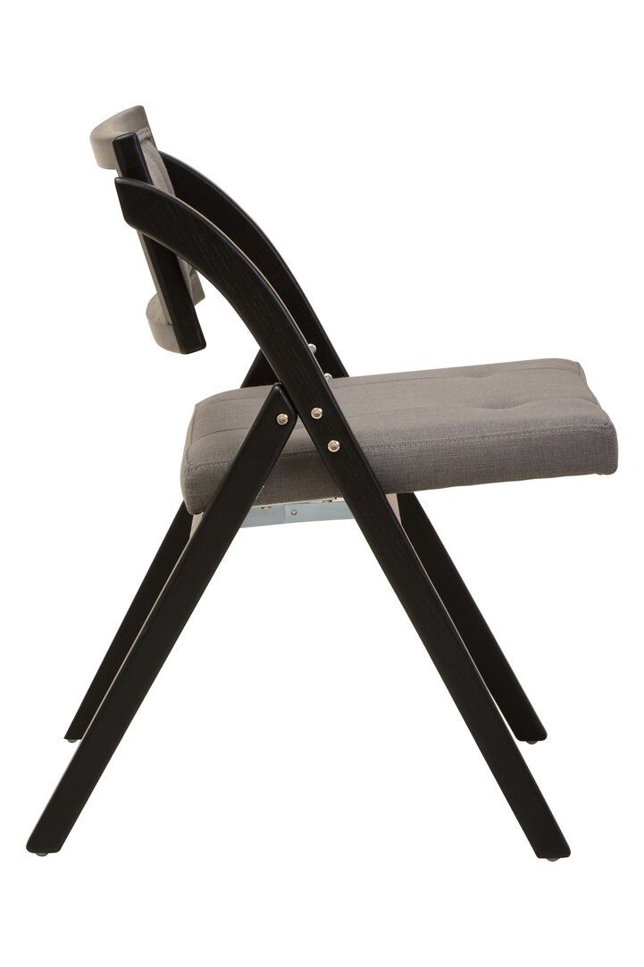 The MORWYNNE folding chair offers a comfortable grey fabric seat and back, paired with a chic black elm wood frame. Its angular folding frame ensures easy, space-saving storage.