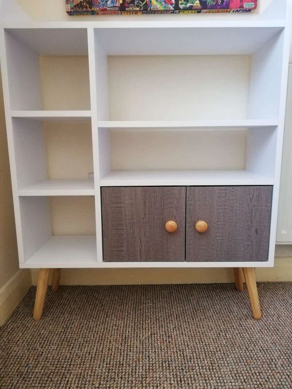 Say hello to beautiful and simple storage with this bookcase from. Made from particle board for a solid structure, it's formed with two open shelves, three small open cubes, a double-door cabinet and and a wide surface top - plenty of room for keeping books, plants, photos, candles etc on. Pine wood legs in an outward-angled manner help create balance and sturdiness. A great way to enhance your living space whilst getting everything organised.