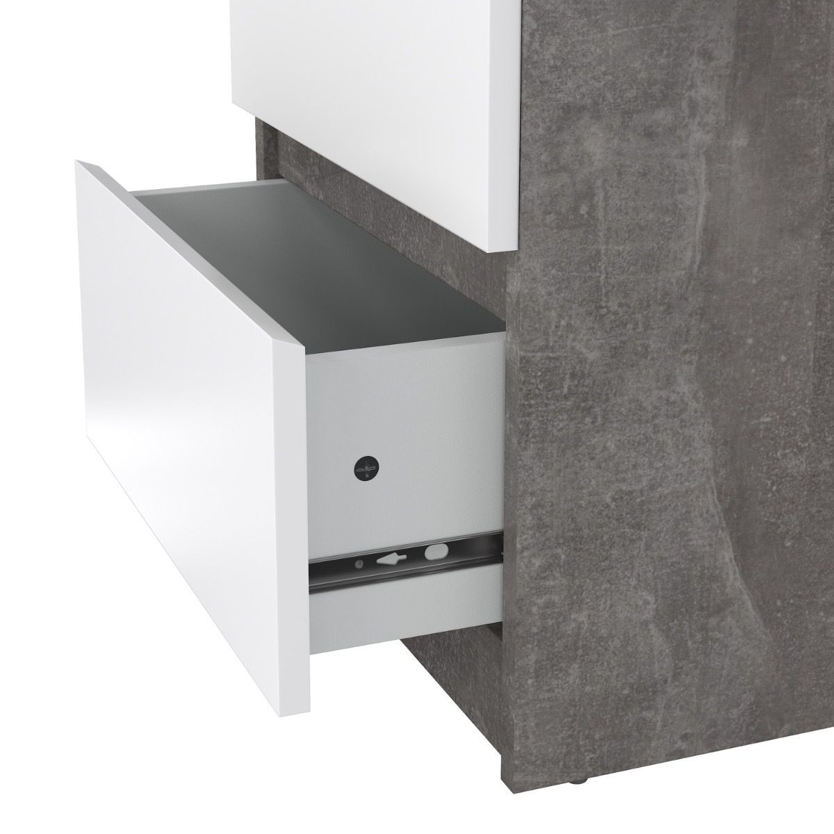 Bring industrial flair into your home with the NANAIMO bedside table in a concrete and white matt finish, a perfect fusion of urban design and modern functionality. Its cement-like finish lends a raw, edgy look, while the white matt drawer fronts keep the design light and contemporary. This blend of textures adds personality to any space, blending with modern loft-style interiors or minimalist themed bedrooms.