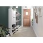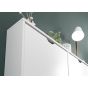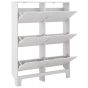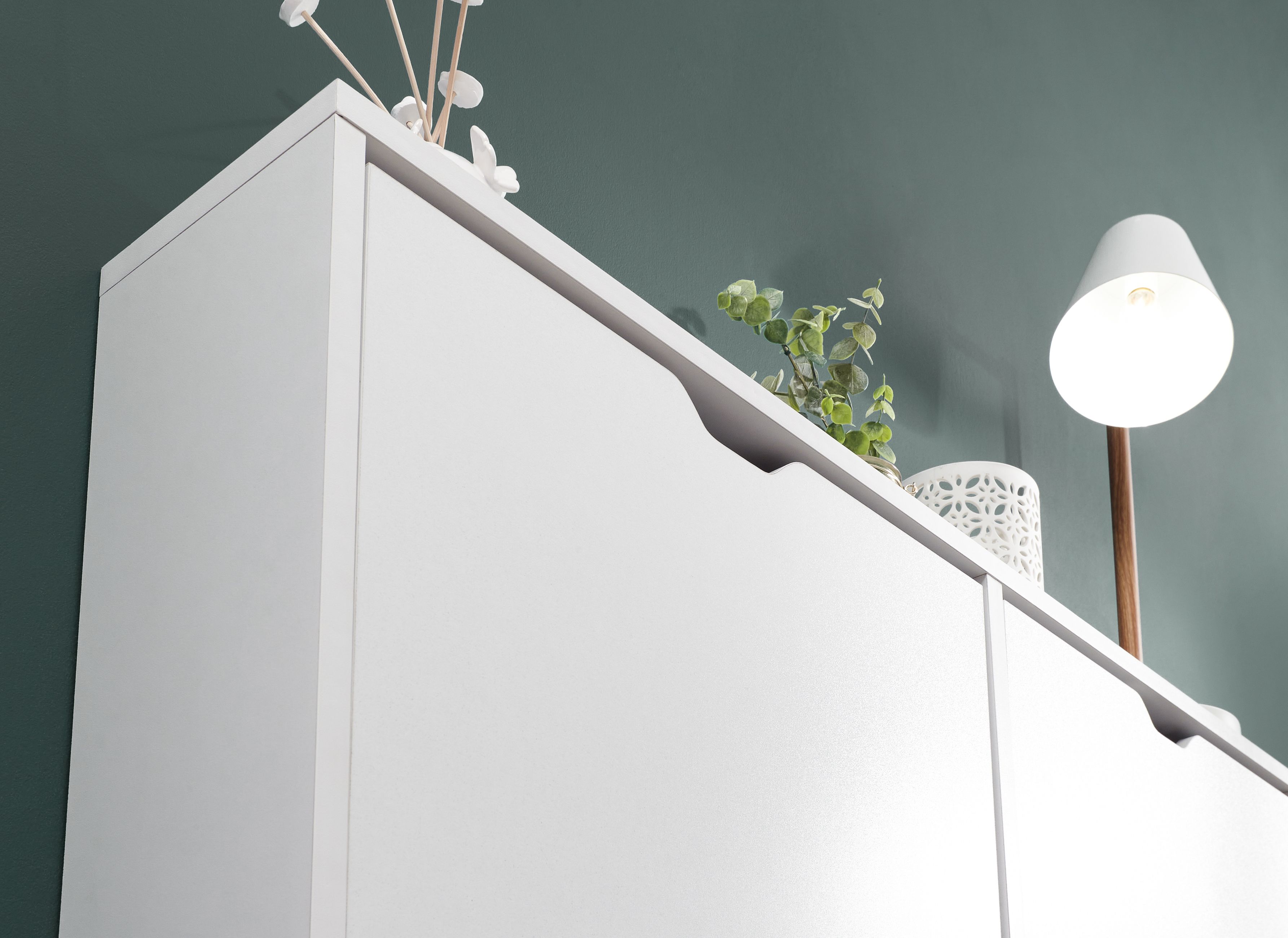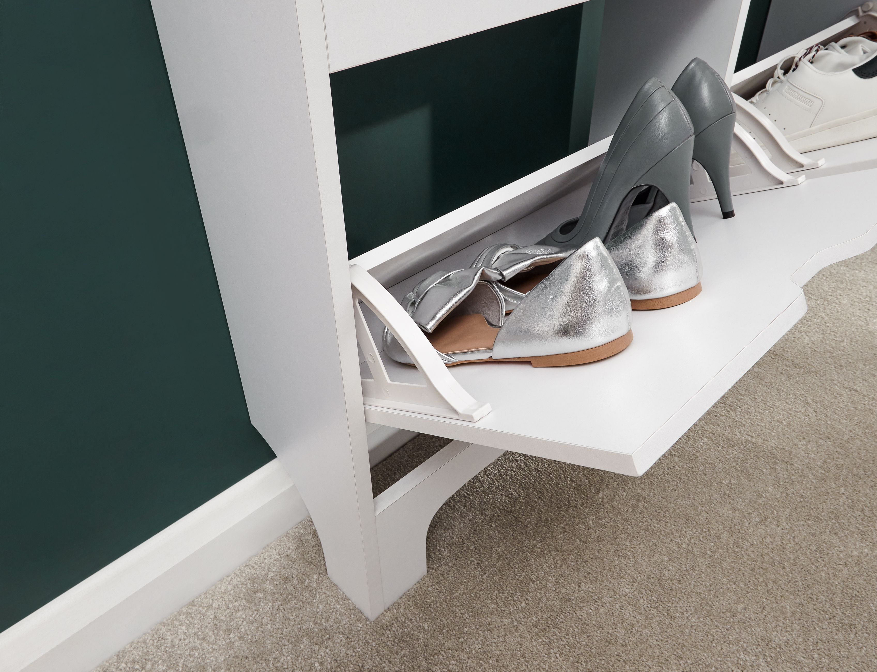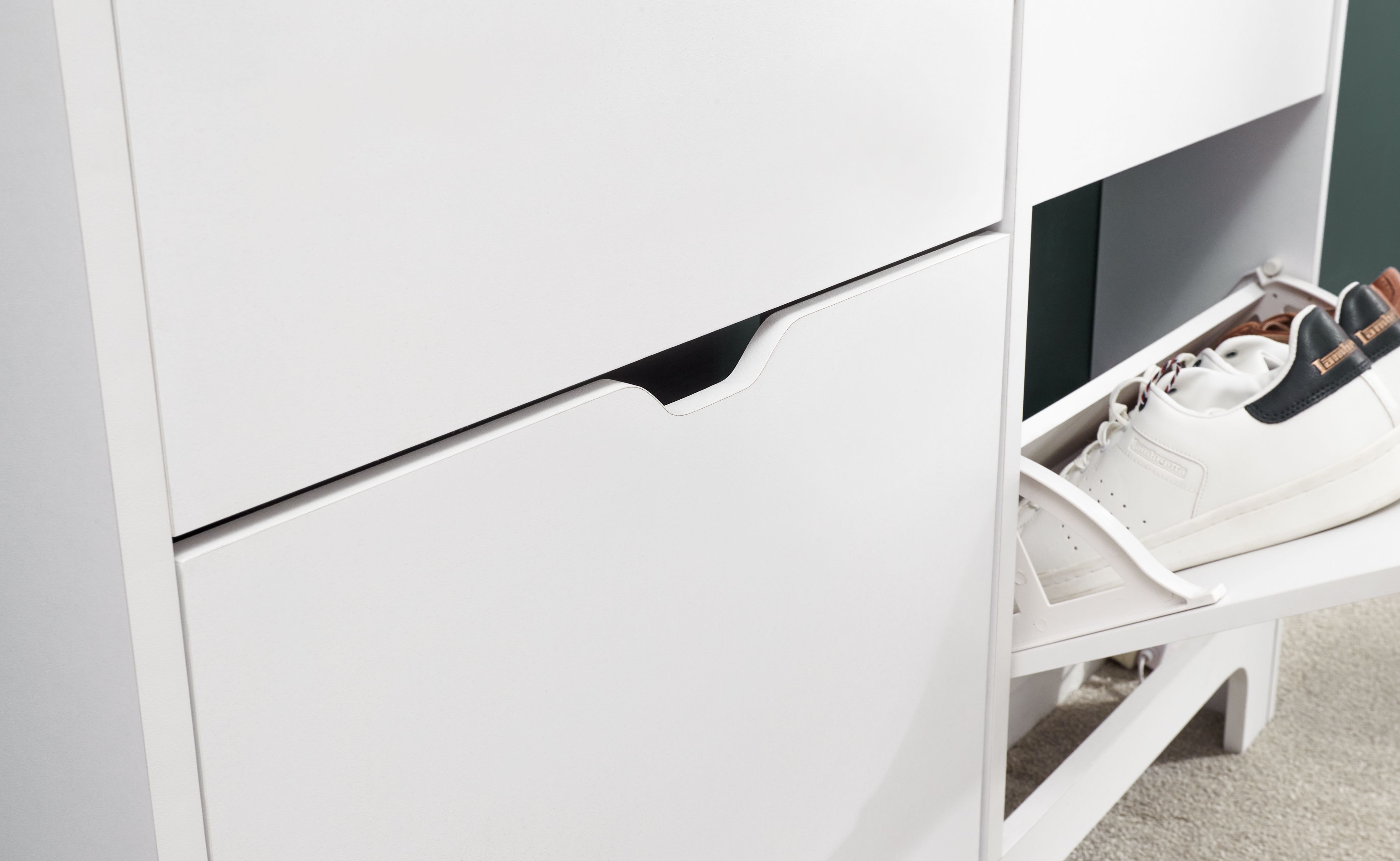 This well-thought-out furnishing piece. The slender cabinet is perfectly suited to narrow spaces as perfect for a hallway or entrance. The cabinets chic matt painted frame is complemented by six pull-down compartments as with space for at least a dozen pairs of standard size mens shoes as and each sporting a neat cut-out handle. The profiled plinth arcs over the skirting board, allowing for a close fit to the wall.