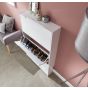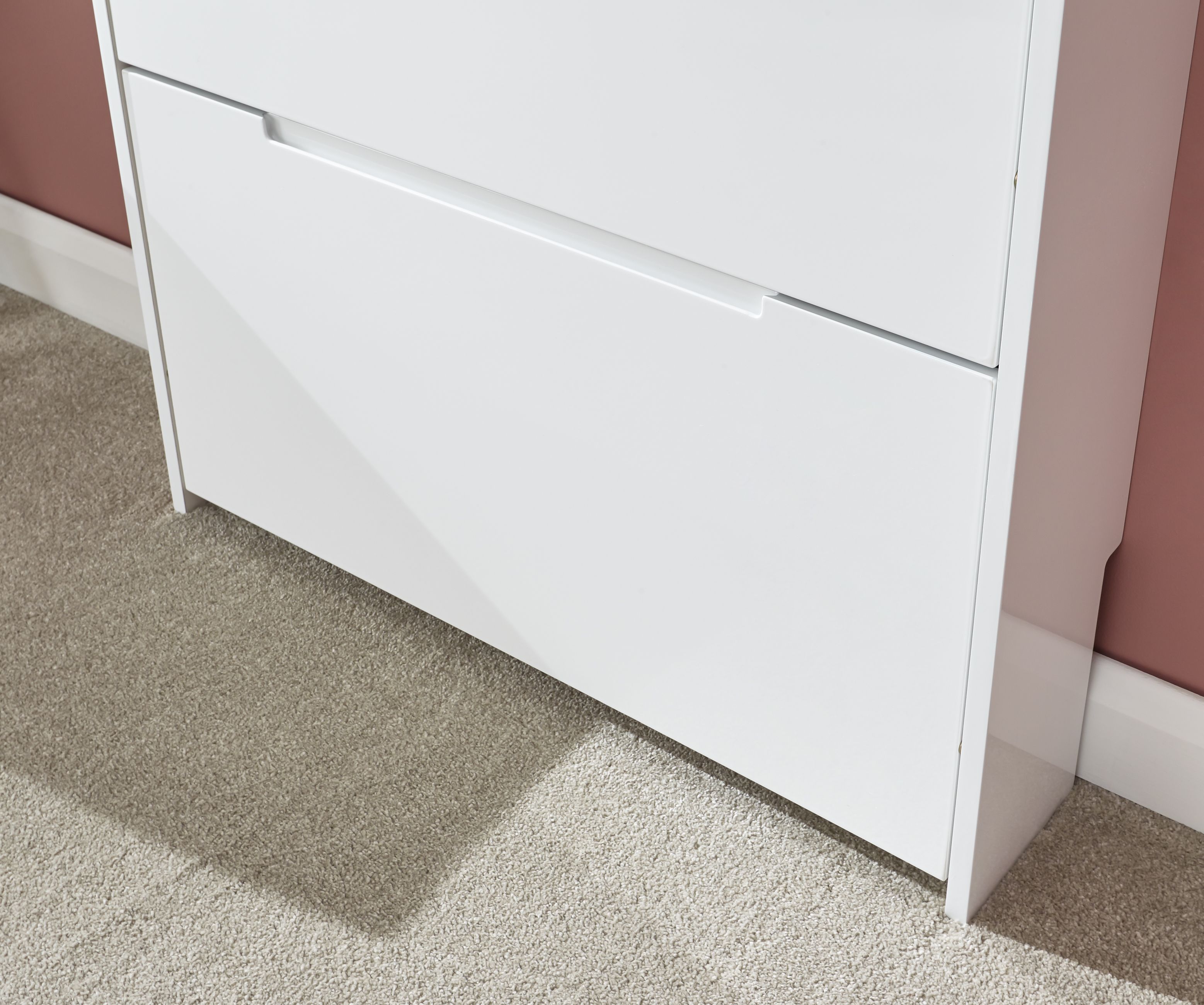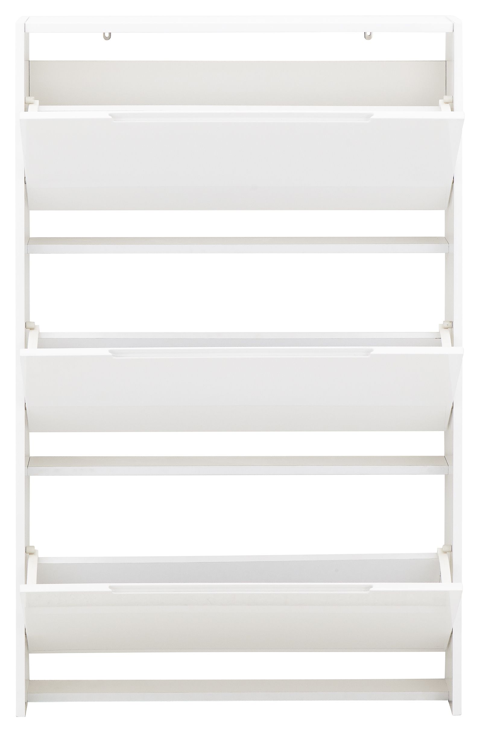 This stylish, shoe cabinet. Ideal for narrow spaces as thanks to its slender construction as the cabinet even incorporates clever profiled side panels that arc over the skirting board to fit neatly against the wall, making use of every centimetre of room. This three-tier version is capable of storing a total of nine pairs of standard mens shoes as three in each compartment, keeping them out of sight and off the floor. The cabinets sleek white or grey frame is a good match for contemporary colour schemes and can be discreetly positioned in the hall or bedroom.