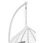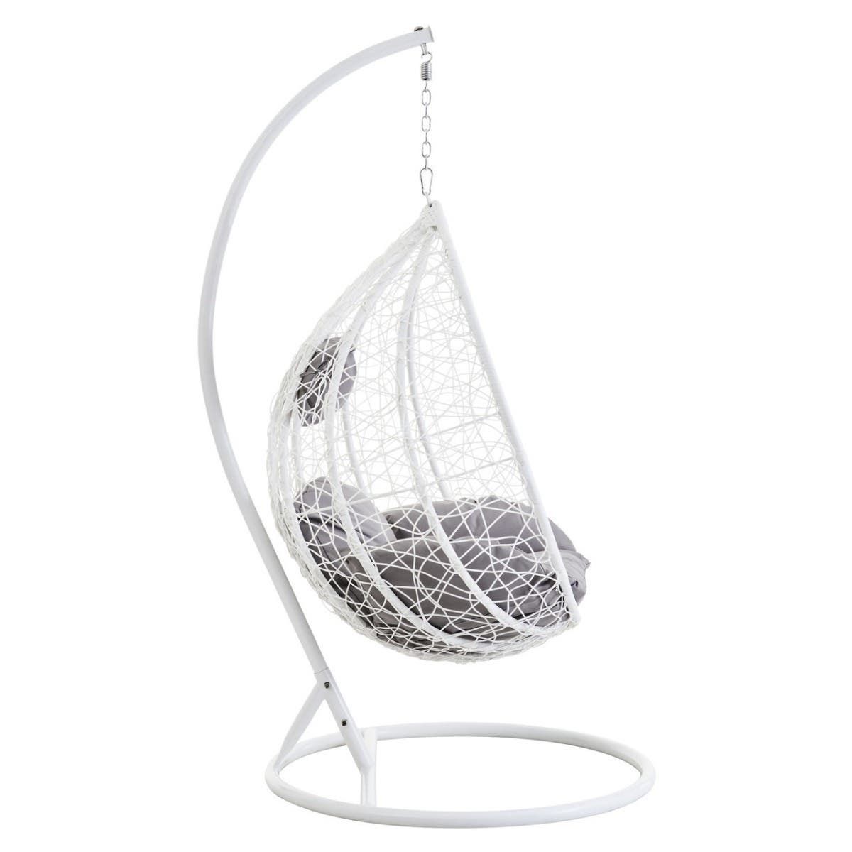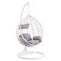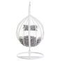 The NAVAGIO hanging chair features a white rattan effect, and its grey cushions with a white metal frame giving it a modern look. This hanging chair has an egg shaped design that is crafted from white rattan effect. Grey cushions with foam filling add comfort, while the sleek white metal provides stability and a modern look.