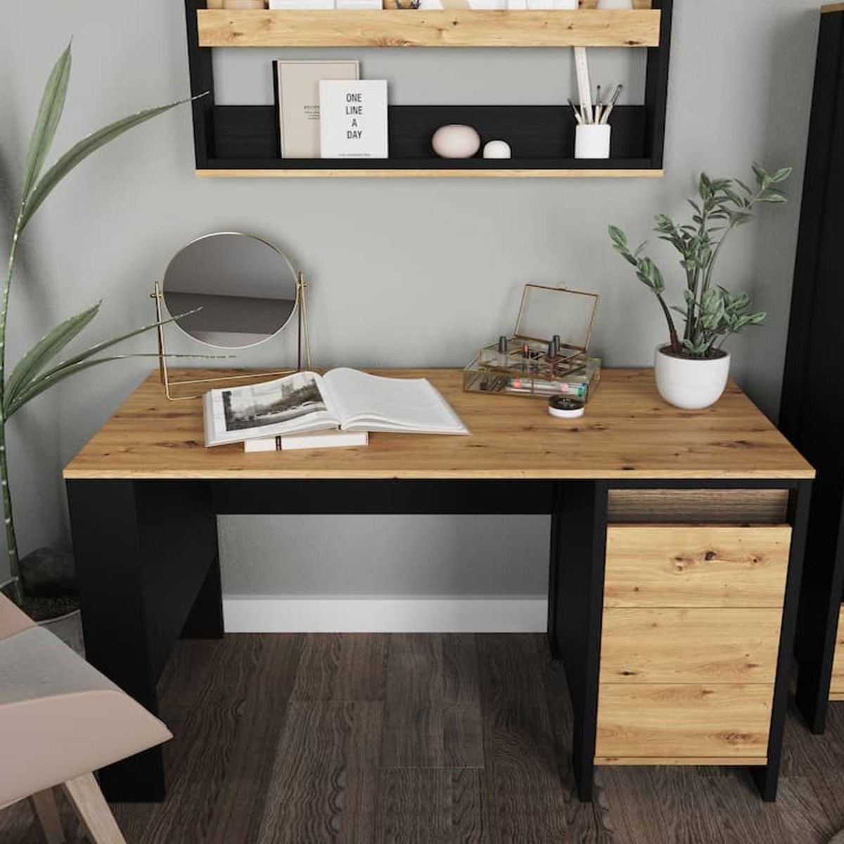 Enhance your workspace with the Naxon Wing Desk, where contemporary elegance meets practicality. Crafted with a sleek Oak Artisan front and a durable Black Matte carcass, it seamlessly combines style and functionality. The industrial silhouette and matte finish offer a perfect balance, providing a sturdy desk that's both stylish and practical. The inclusion of one hinged door, a drawer, and LED lighting makes it a versatile and efficient addition to any space. With high-quality 16mm laminated board construction, this desk is not just a piece of furniture; it's a statement of modern craftsmanship.