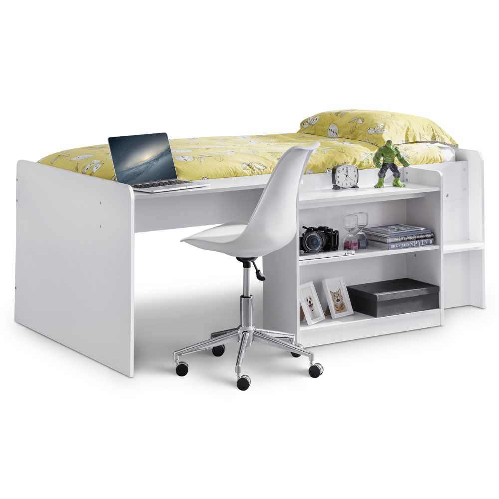 Featuring a desk and 2 large shelves, along with additional underbed storage to free up some floor space for books, toys and more. Crafted from sturdy particleboard with foil, this bed has a wooden slatted base and fits a UK single mattress