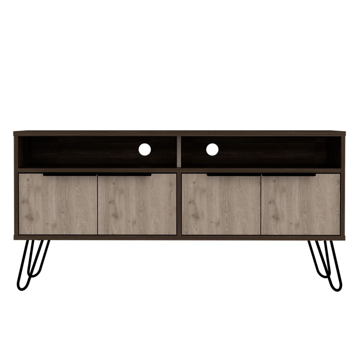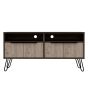 This wide screen TV unit accommodates up to a 55" television with ample open storage for gadgets along with extra storage space encloed behind four doors. Finshed in a smoked oak effect and contrasting bleached grey oak effect doors with black pull handles and hairpin shape legs