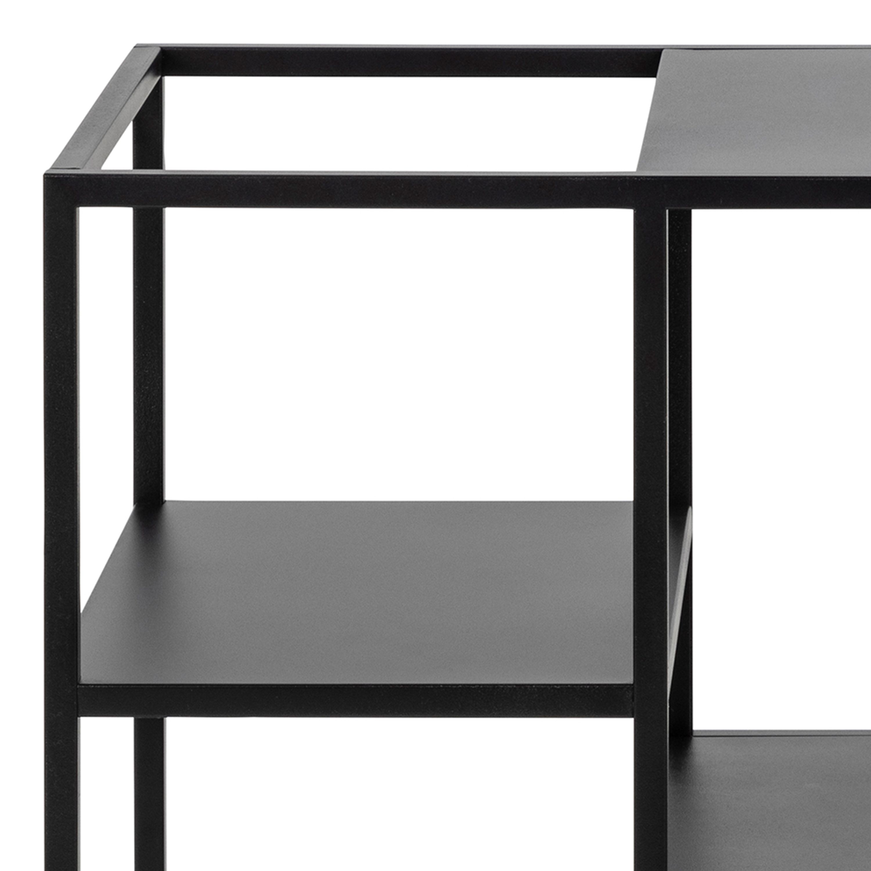 This serving trolley is a versatile addition to your home. Crafted with a top, 3 shelves, and base in matt black rough powder-coated steel, it exudes modern sophistication. With an asymmetrical detail, this trolley adds both style and functionality to your living space.
