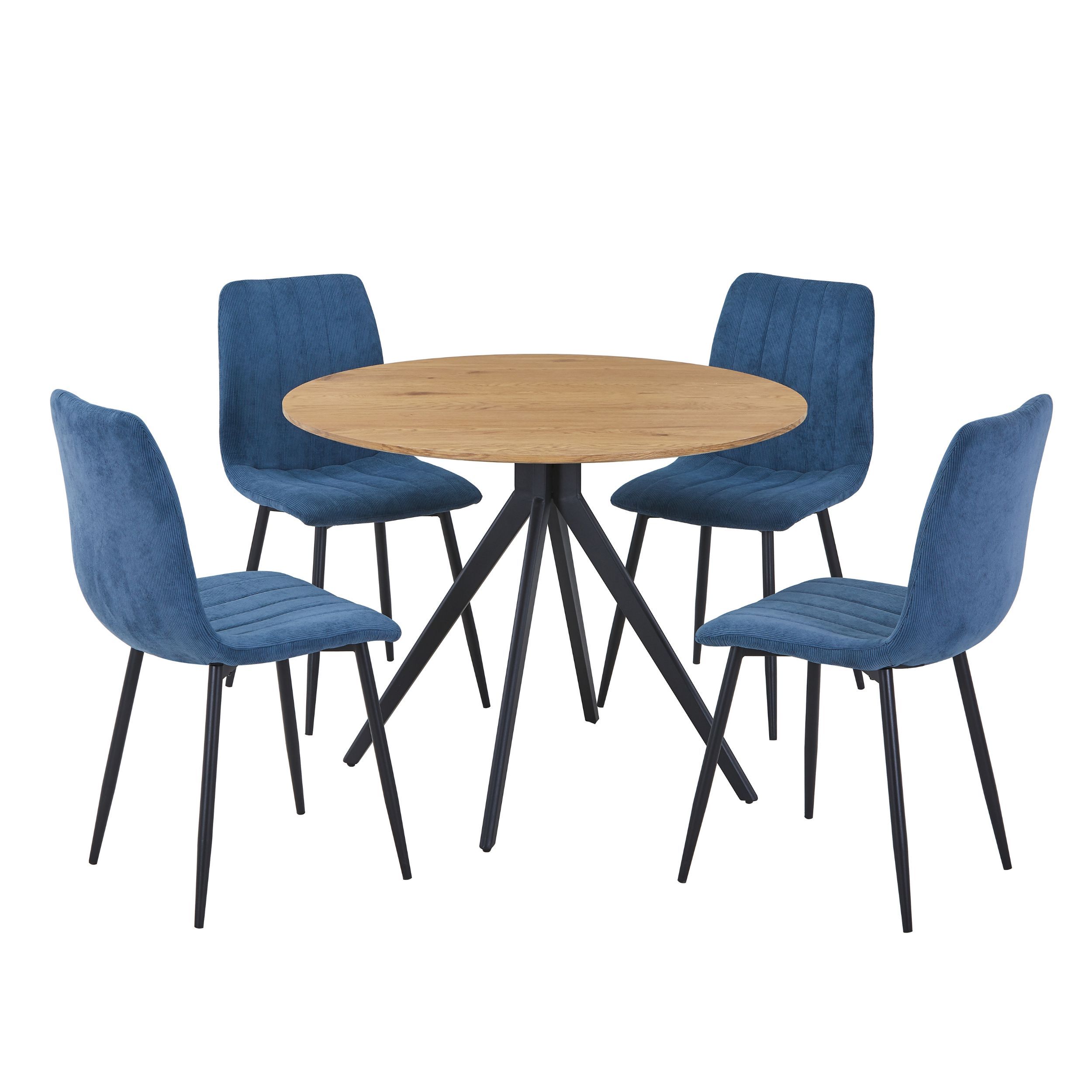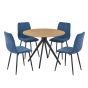 NEXO Round Dining Table with 4 Straight Stitch Fabric Chairs - Light Oak with Blue
