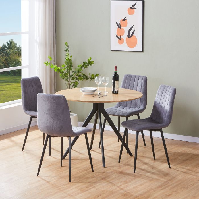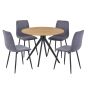 NEXO Round Dining Table with 4 Straight Stitch Fabric Chairs - Light Oak with Grey