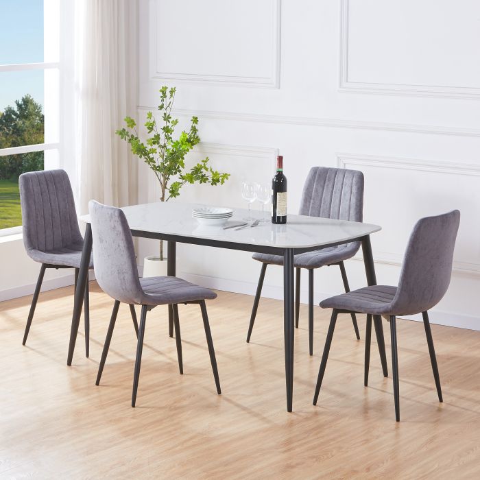 NEXO Sintered Stone Rectangular Dining Table with 4 Straight Stitch Fabric Chairs - Gloss White with Grey