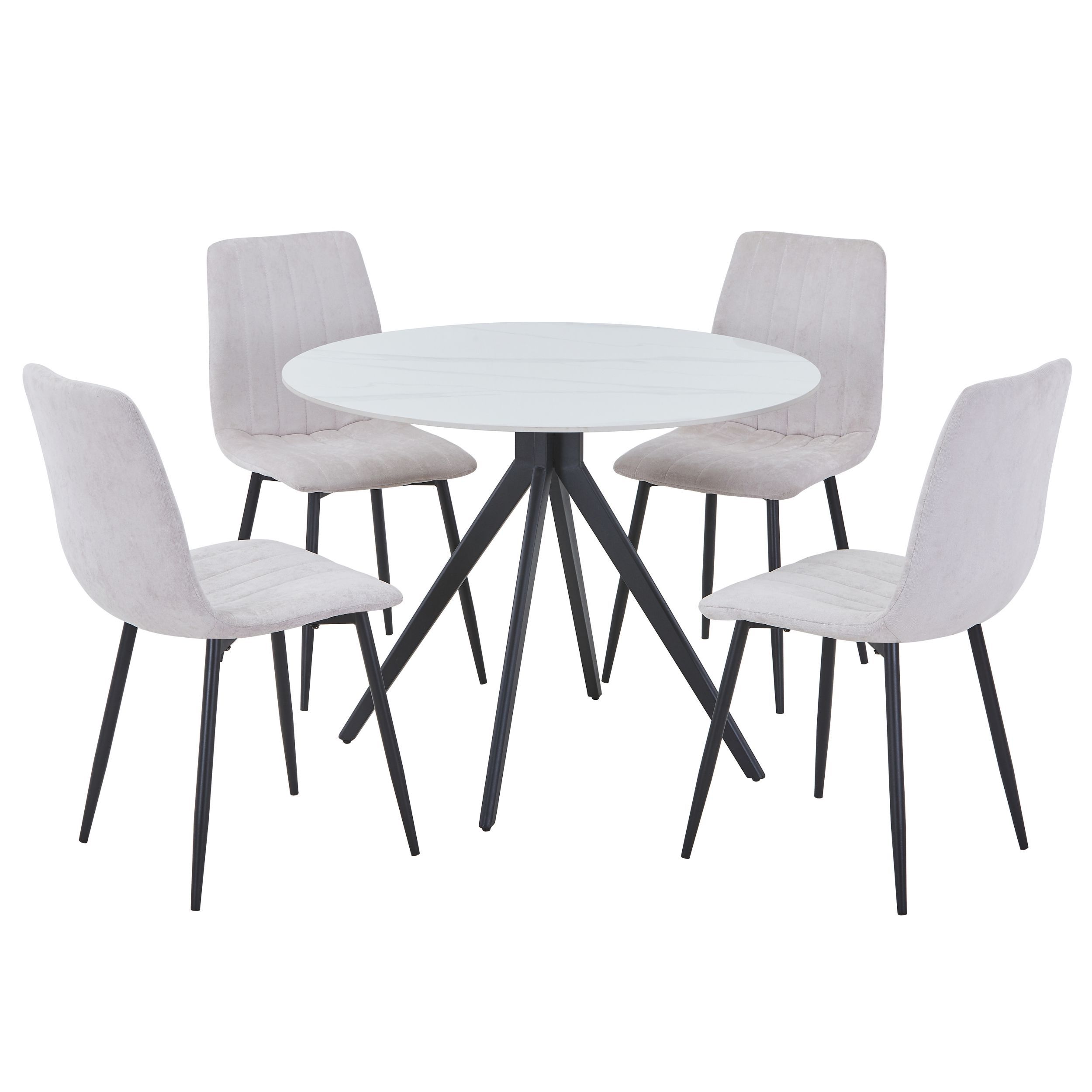 NEXO Sintered Stone Round Dining Table with 4 Straight Stitch Fabric Chairs - Gloss White with Natural